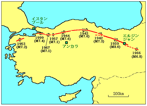 1967年の震源域の西隣りは未破壊領域として警戒されていましたが, ここに1999年8月,M7.4のトルコ大地震(イズミット地震)が発生したことは記憶に新しいところです.