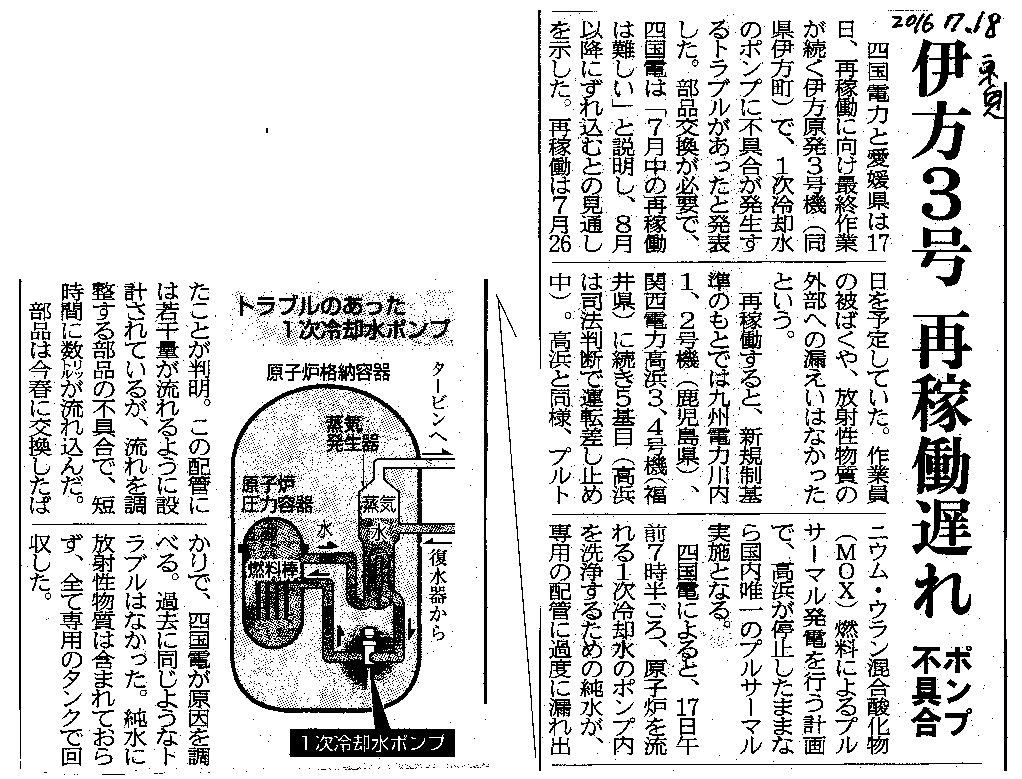 [2016_07_18_01]伊方3号 再稼働遅れ ポンプ不具合(東奥日報2016年7月18日)