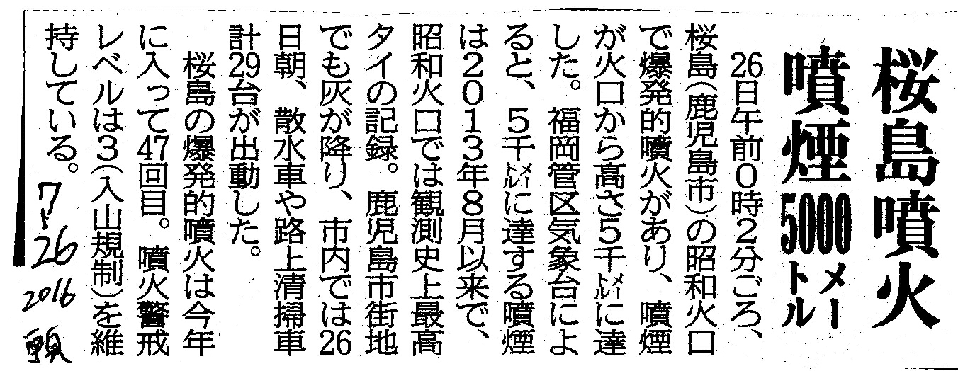 [2016_07_26_03]桜島噴火 噴煙5000メートル(東奥日報2016年7月26日)