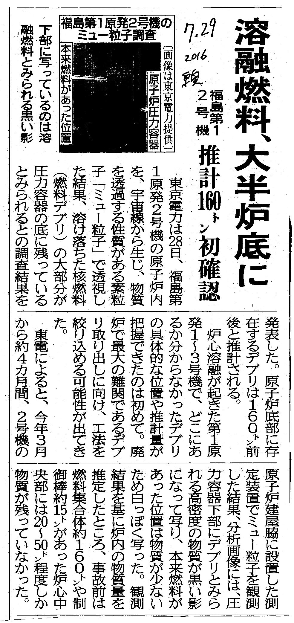 [2016_07_29_03]溶融燃料、大半炉底に 福島第一2号機 推計160トン初確認(東奥日報2016年7月29日)