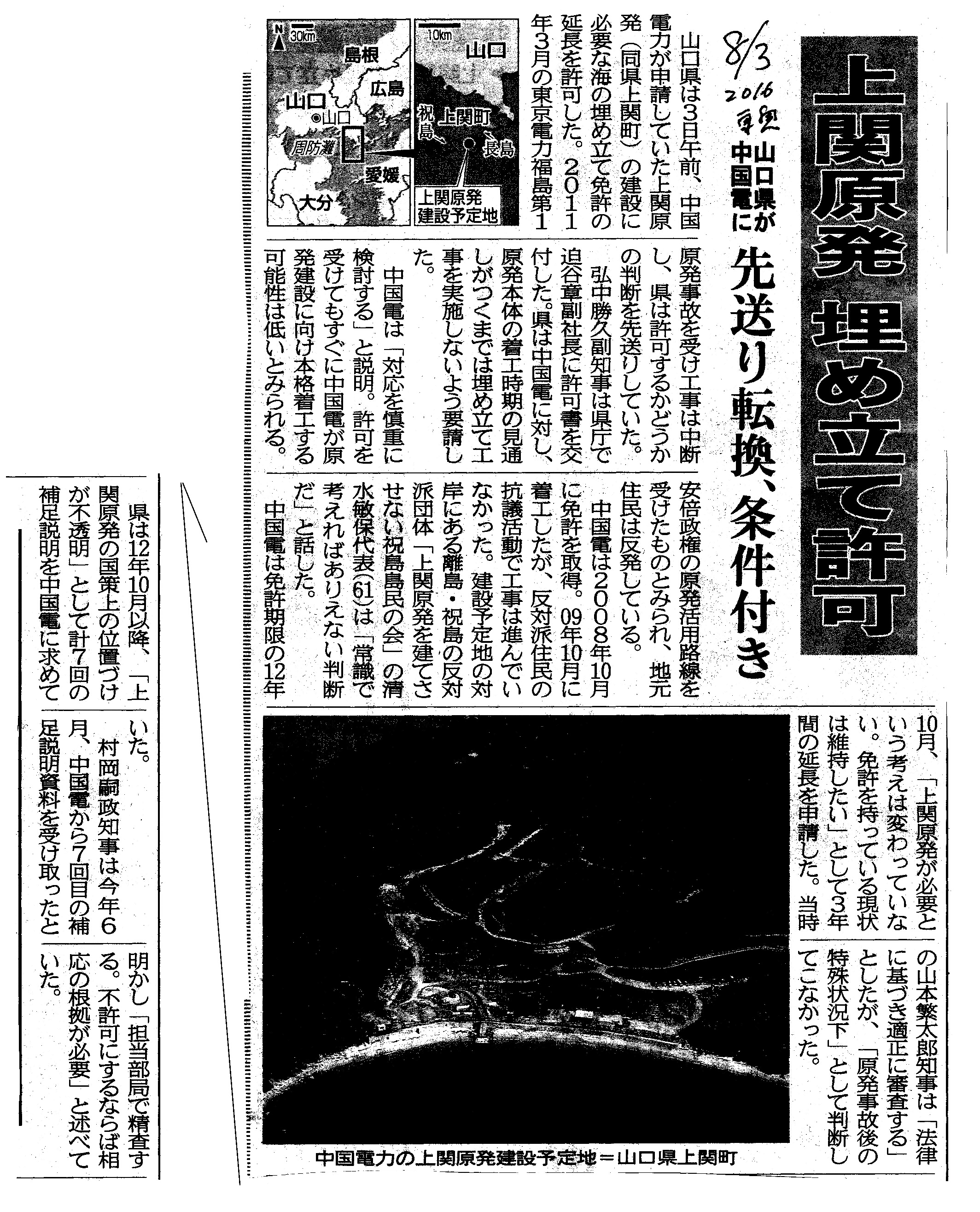 [2016_08_03_02]上関原発 埋め立て許可 山口県が中国電に 先送り転換、条件付き(東奥日報2016年8月3日)