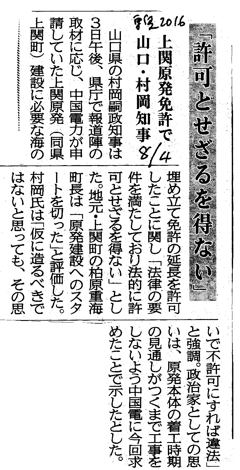 [2016_08_04_03]「許可とせざるを得ない」 上関原発免許で山口・村岡知事(東奥日報2016年8月4日)