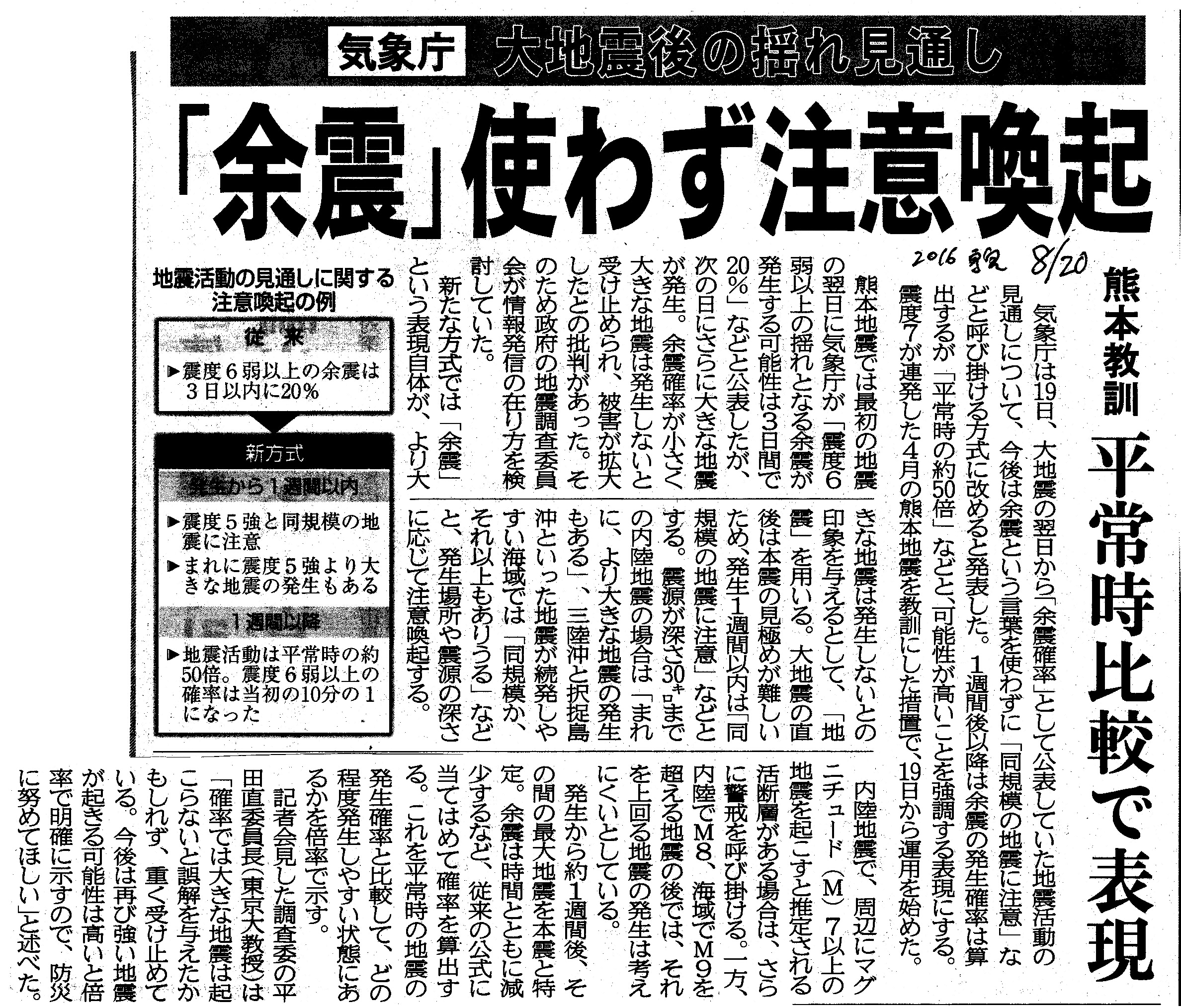 [2016_08_20_04]気象庁 大地震後の揺れ見直し 「余震」使わず注意喚起 熊本教訓 平常時比較で表現(東奥日報2016年8月20日)