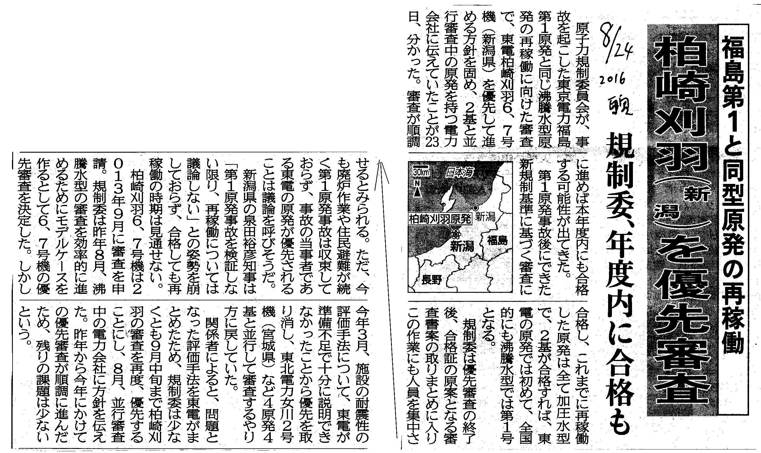 [2016_08_24_01]福島第1と同型原発の再稼働 柏崎刈羽(新潟)を優先審査 規制委、年度内に合格も(東奥日報2016年8月24日)
