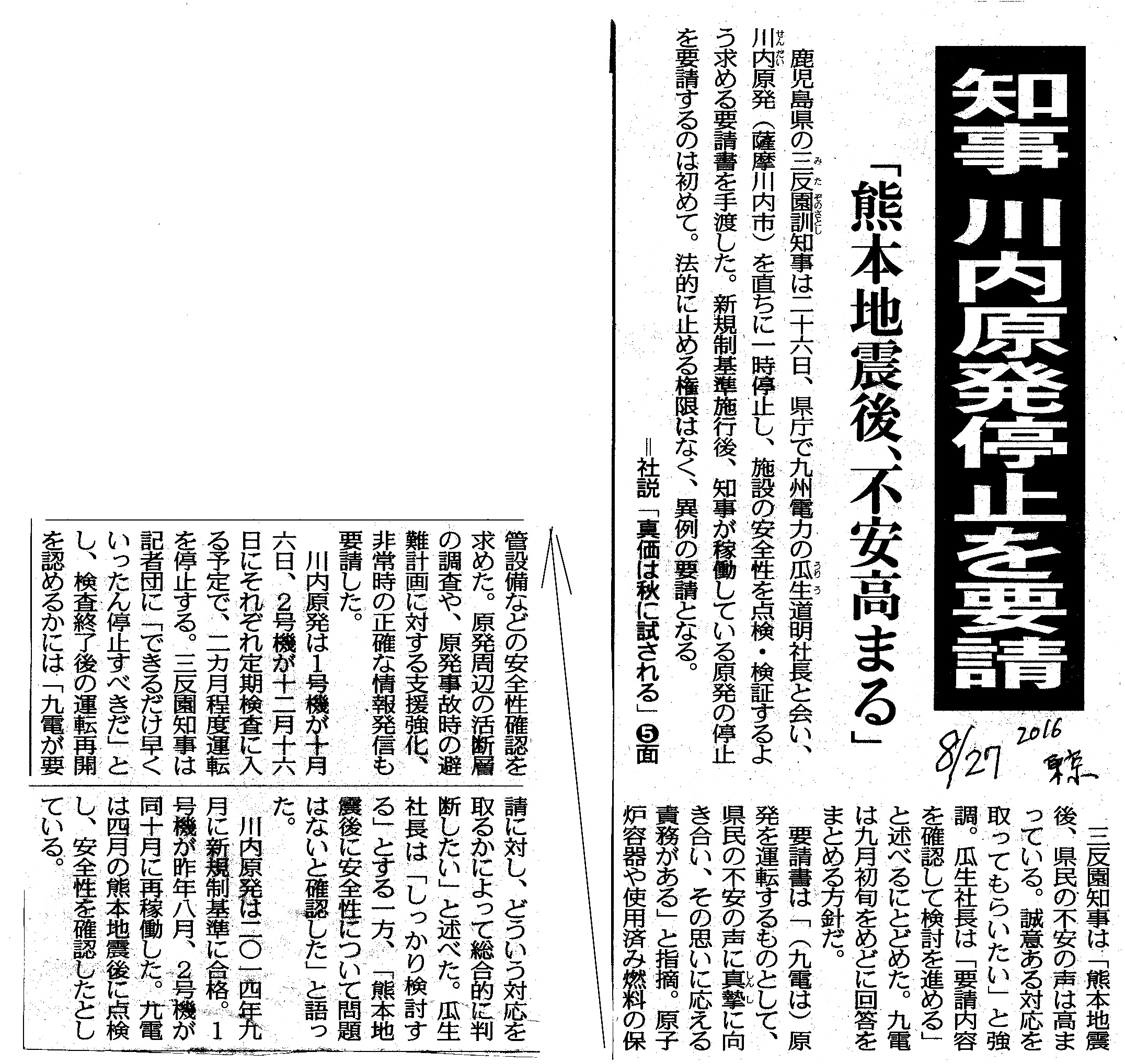 [2016_08_27_03]知事 川内原発停止を要請 「熊本地震後、不安高まる」(東京新聞2016年8月27日)