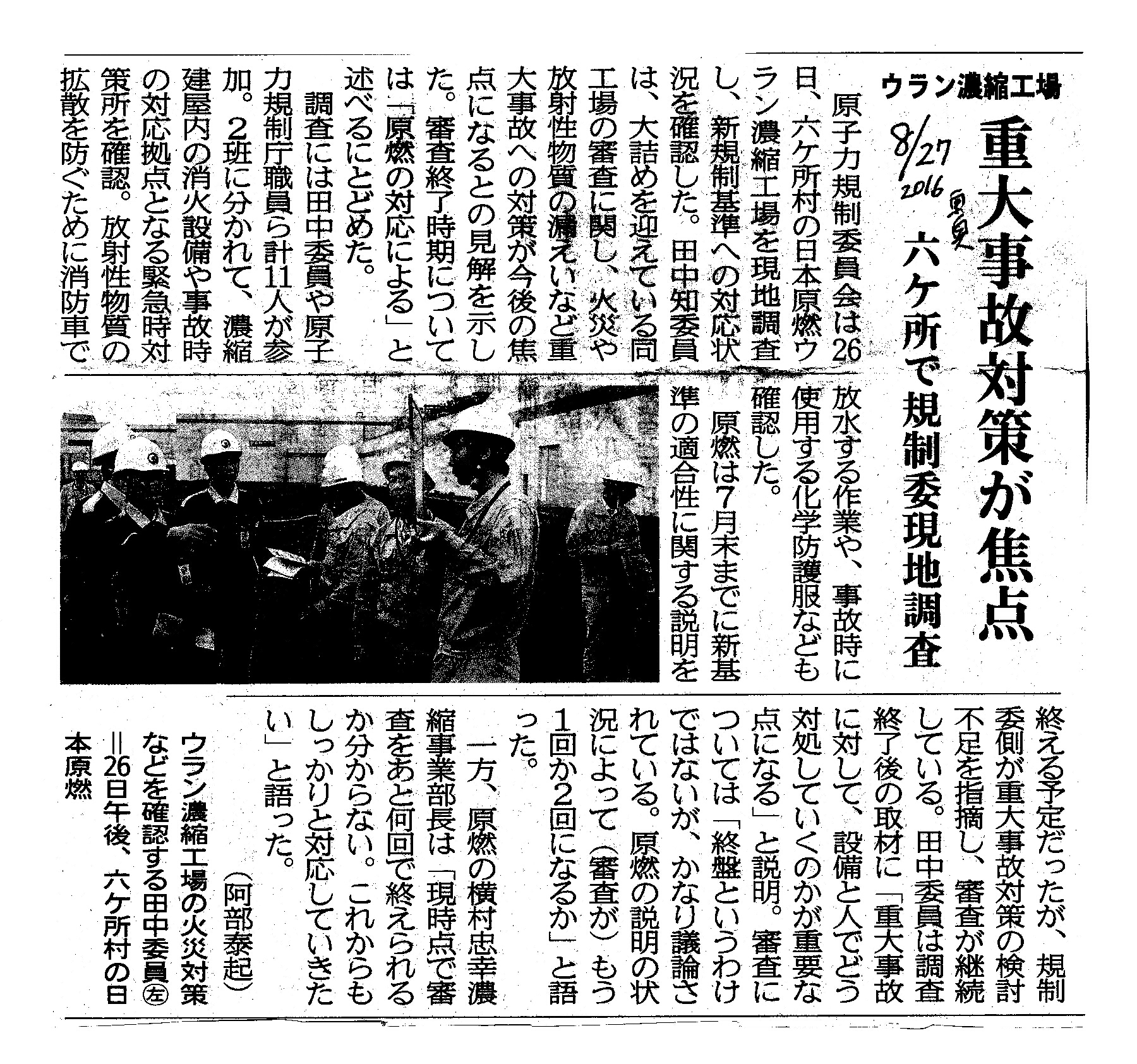 | [2016_08_27_04]ウラン濃縮工場 重大事故対策が焦点 六ヶ所で規制委現地調査(東奥日報2016年8月27日) |