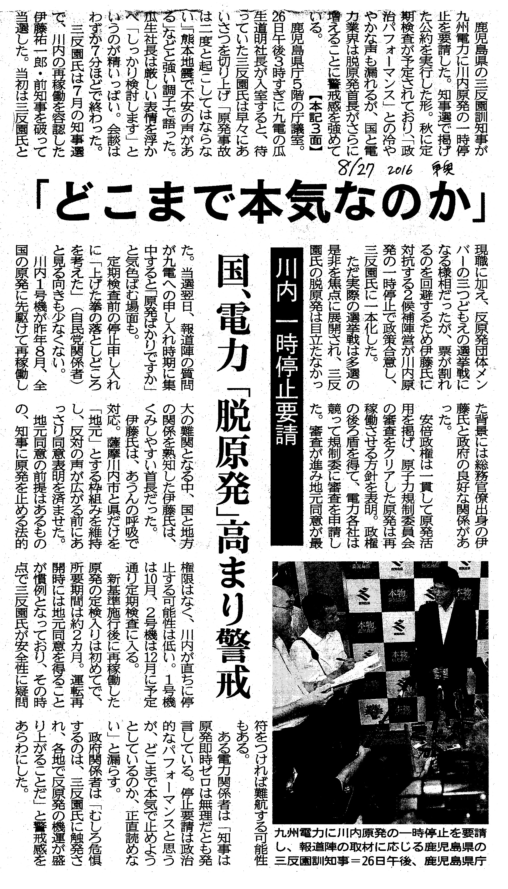 [2016_08_27_05]「どこまで本気なのか」 川内一時停止要請 国、電力「脱原発」高まり警戒(東奥日報2016年8月27日)