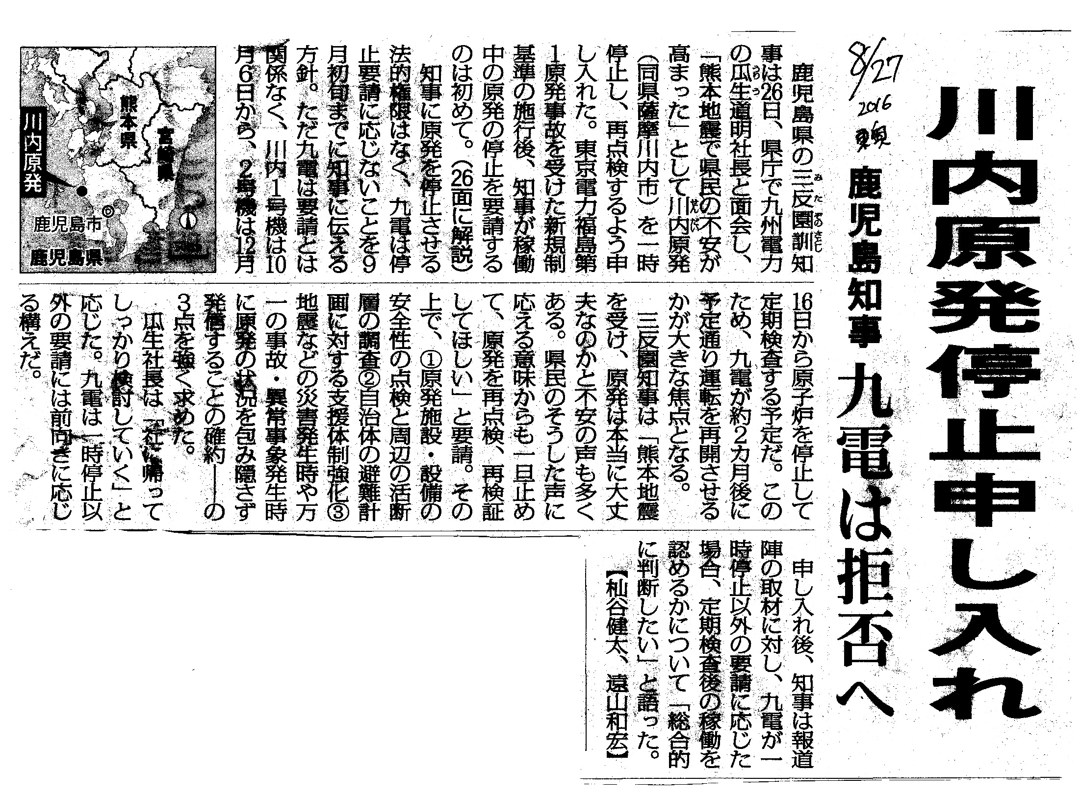 [2016_08_27_06]川内原発停止申し入れ 鹿児島知事 九電は拒否へ(東奥日報2016年8月27日)