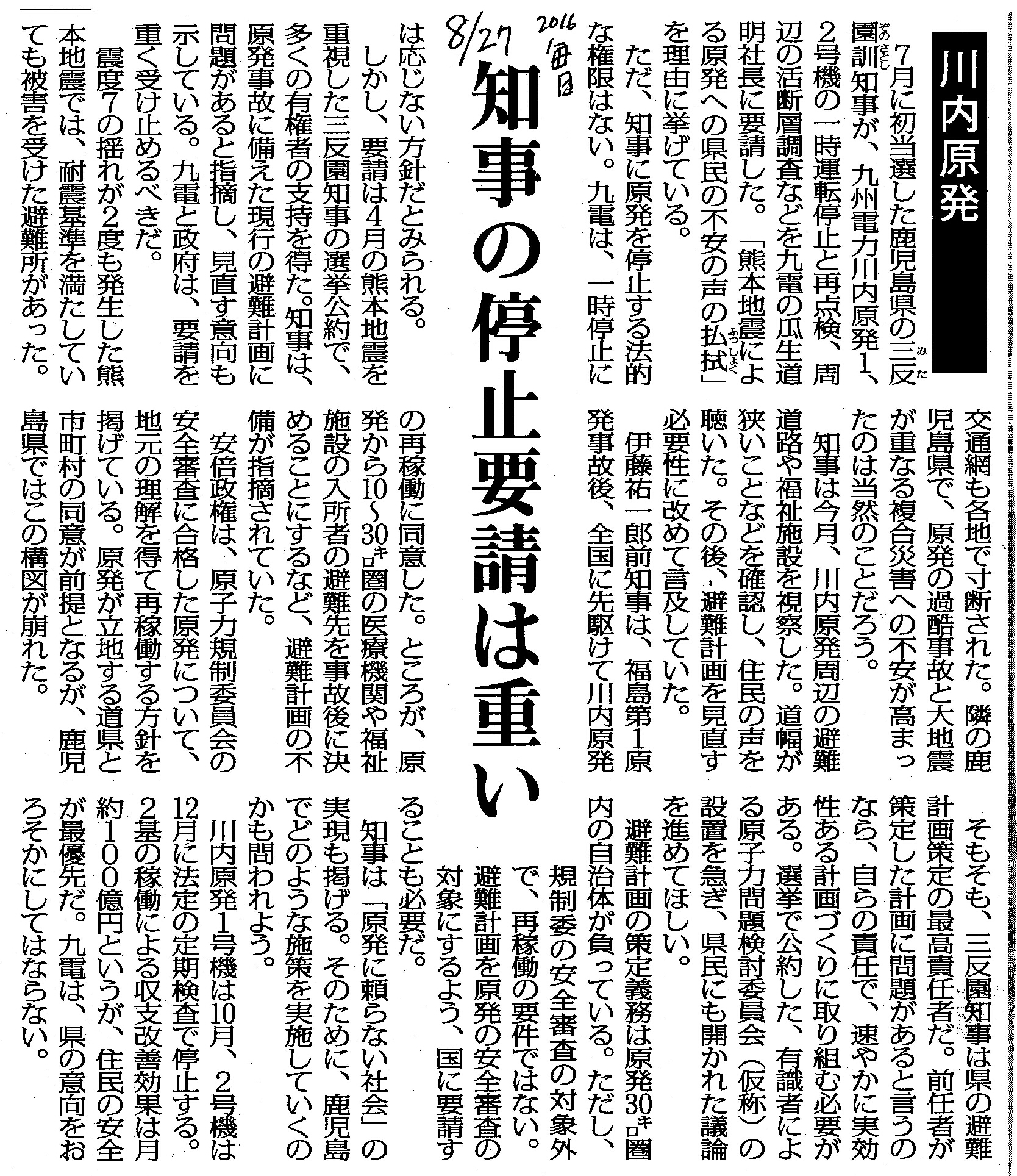 [2016_08_27_07]川内原発 知事の停止要請は重い(毎日新聞2016年8月27日)