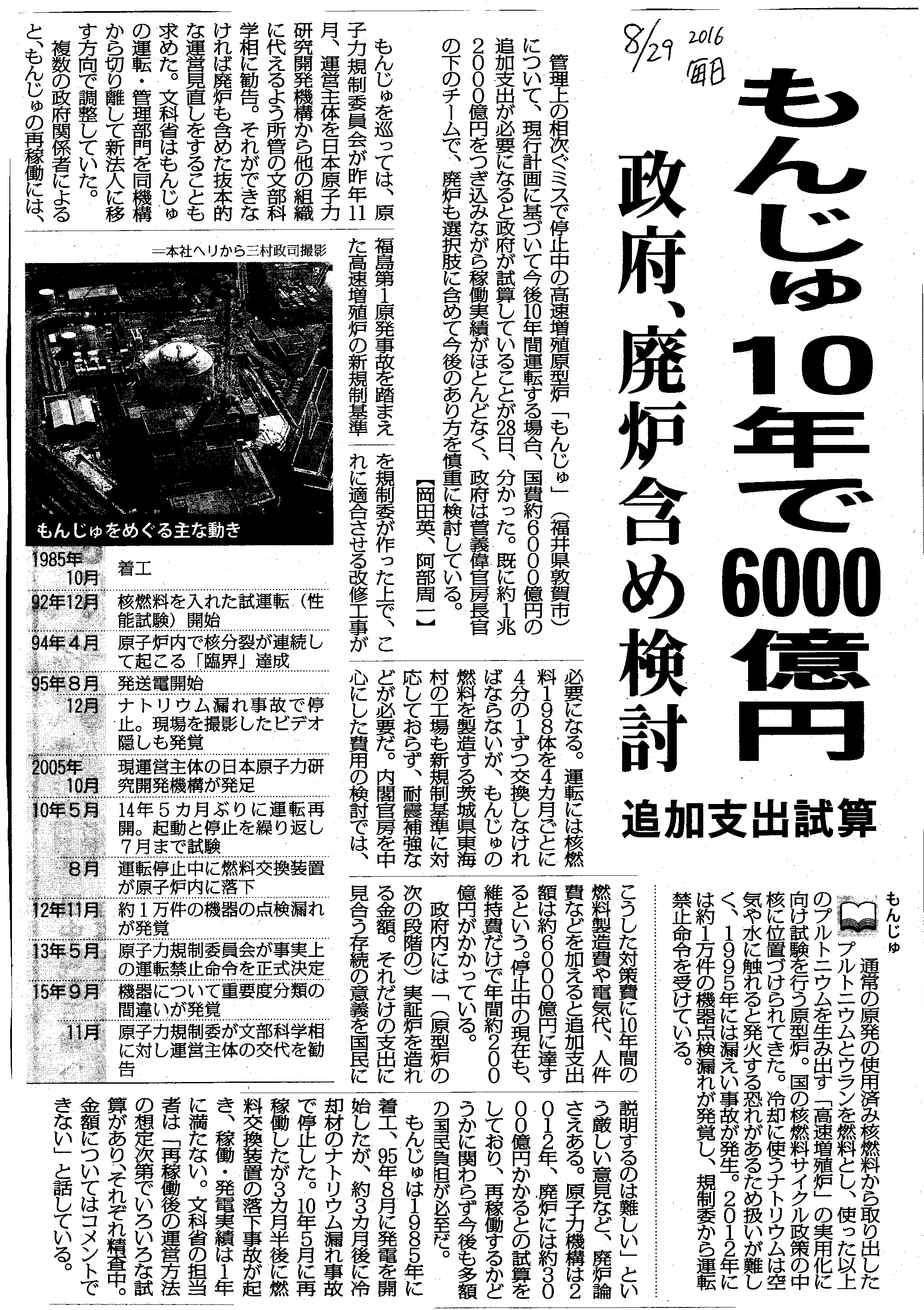 [2016_08_29_02]もんじゅ 10年で6000億円 政府、廃炉含め検討 追加支出試算(毎日新聞2016年8月29日)
