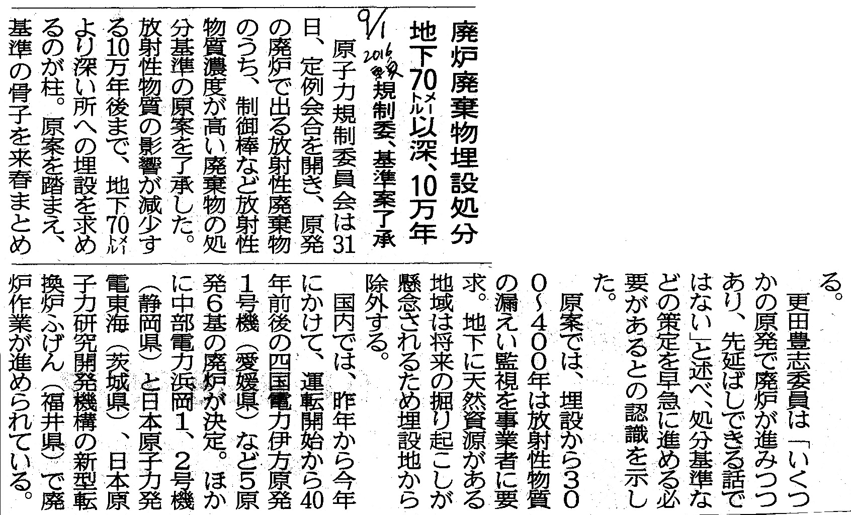 [2016_09_01_04]廃炉廃棄物埋設処分 地下70メートル以深、10万年 規制委、基準案了承(東奥日報2016年9月1日)