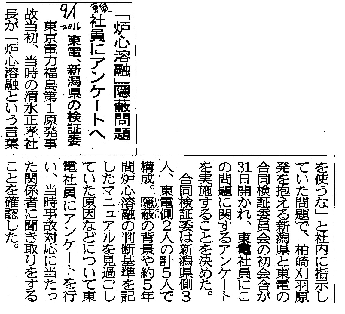 [2016_09_01_07]「炉心溶融」隠蔽問題 社員にアンケートへ 東電、新潟県の検証委(東奥日報2016年9月1日)