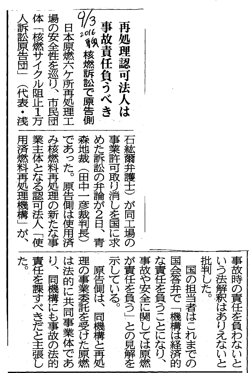 | [2016_09_03_02]再処理認可法人は事故責任負うべき 核燃訴訟で原告側(東奥日報2016年9月3日) |