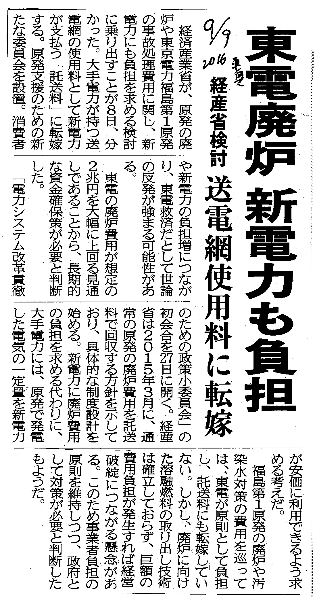 [2016_09_09_02]東電廃炉 新電力も負担 経産省検討 送電網使用料に転嫁(東奥日報2016年9月9日)