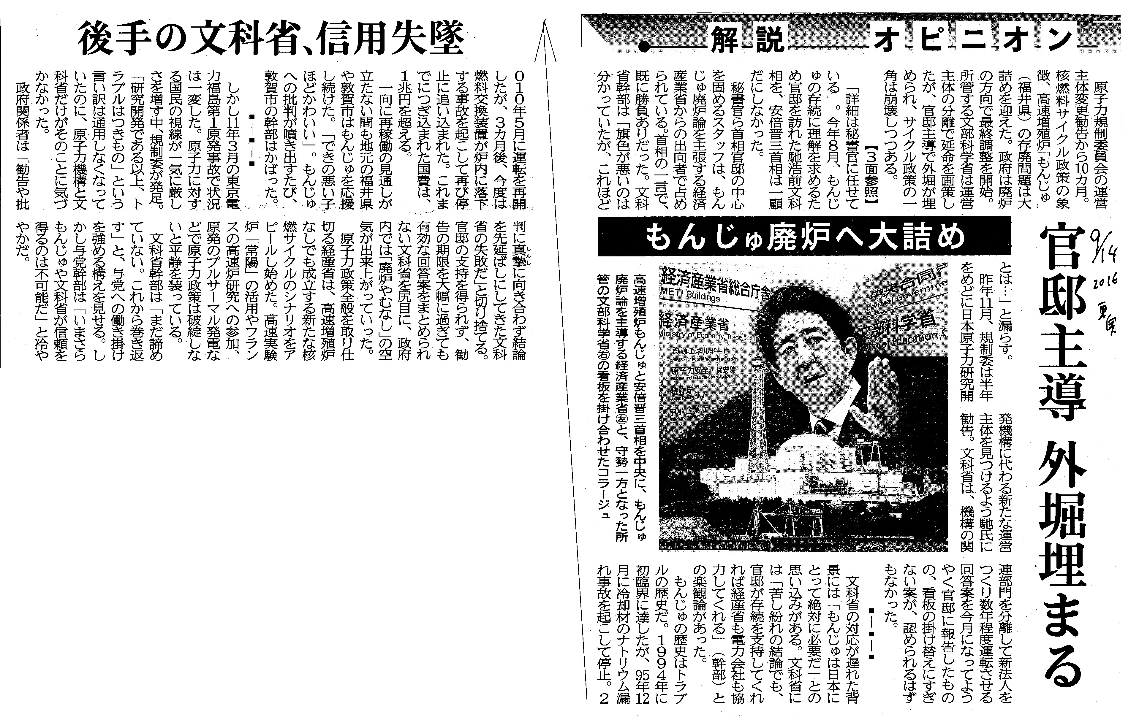 [2016_09_14_04]もんじゅ廃炉へ大詰め 官邸主導 外堀埋まる 後手の文科省、信用失墜(東奥日報2016年9月14日)