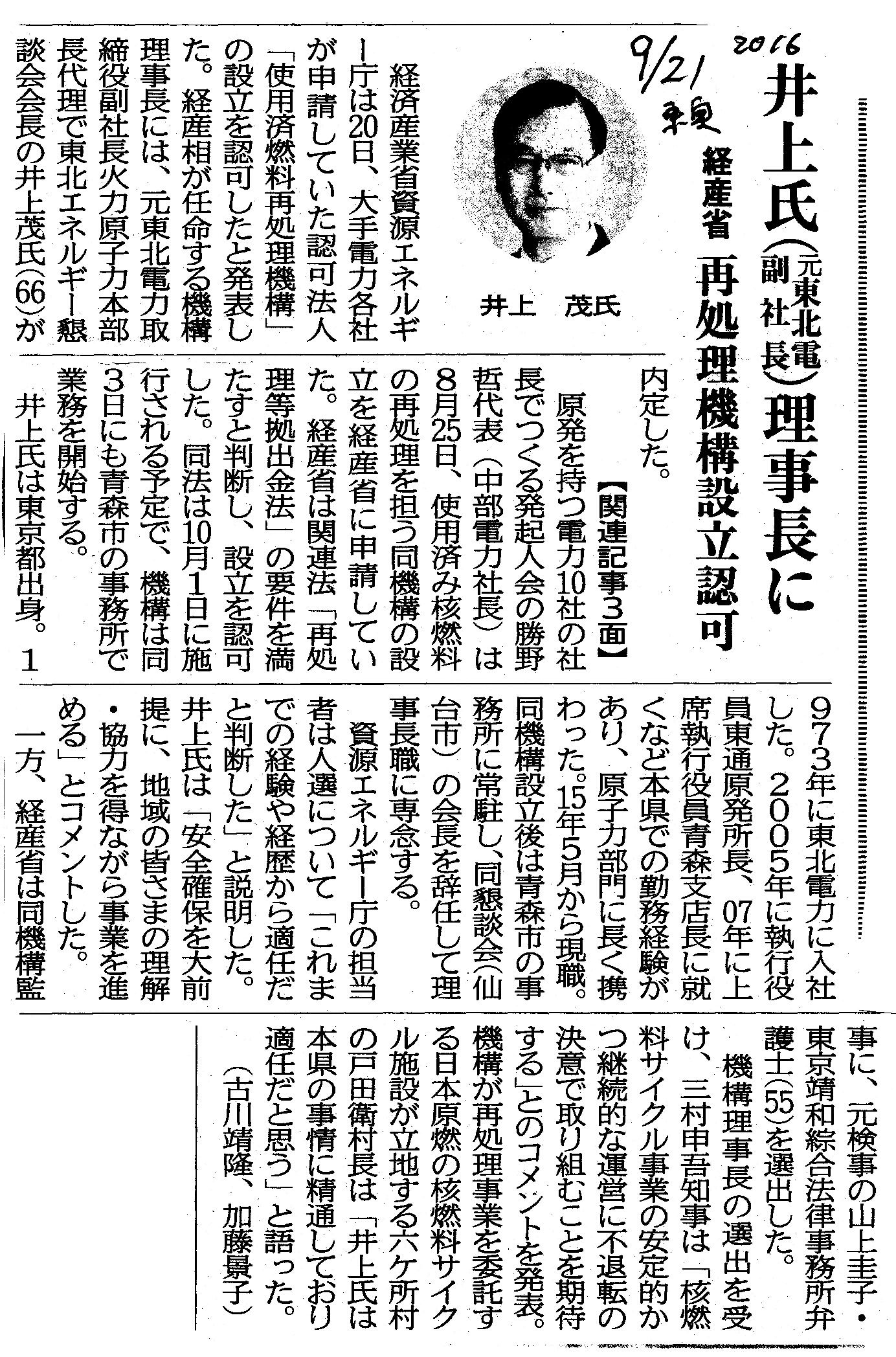 [2016_09_21_01]井上氏(元東北電副社長)理事長に 経産省 再処理機構設立認可(東奥日報2016年9月21日)