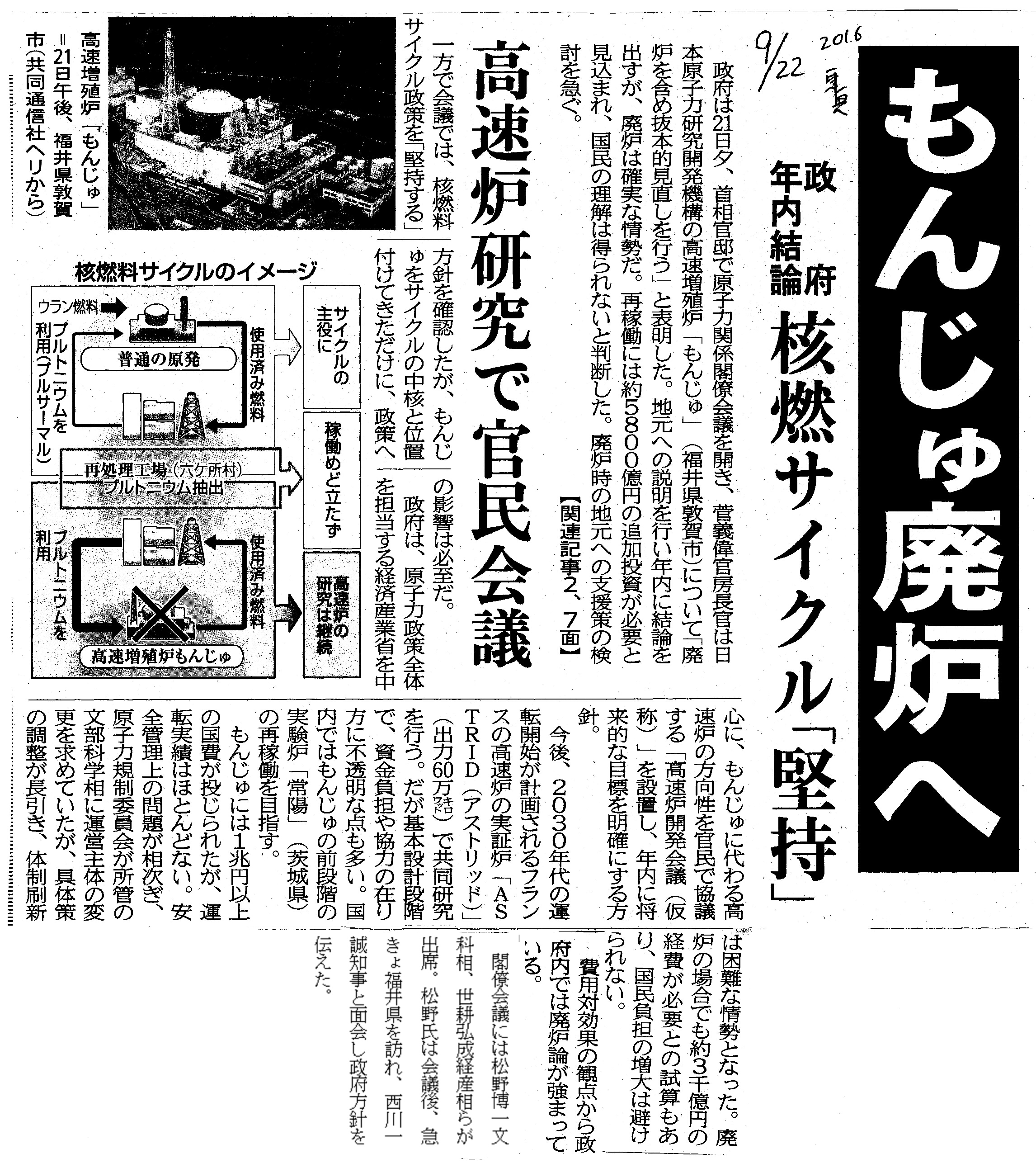 [2016_09_22_01]もんじゅ廃炉へ 年内結論 核燃サイクル「堅持」 高速炉研究で官民会議(東奥日報2016年9月22日)