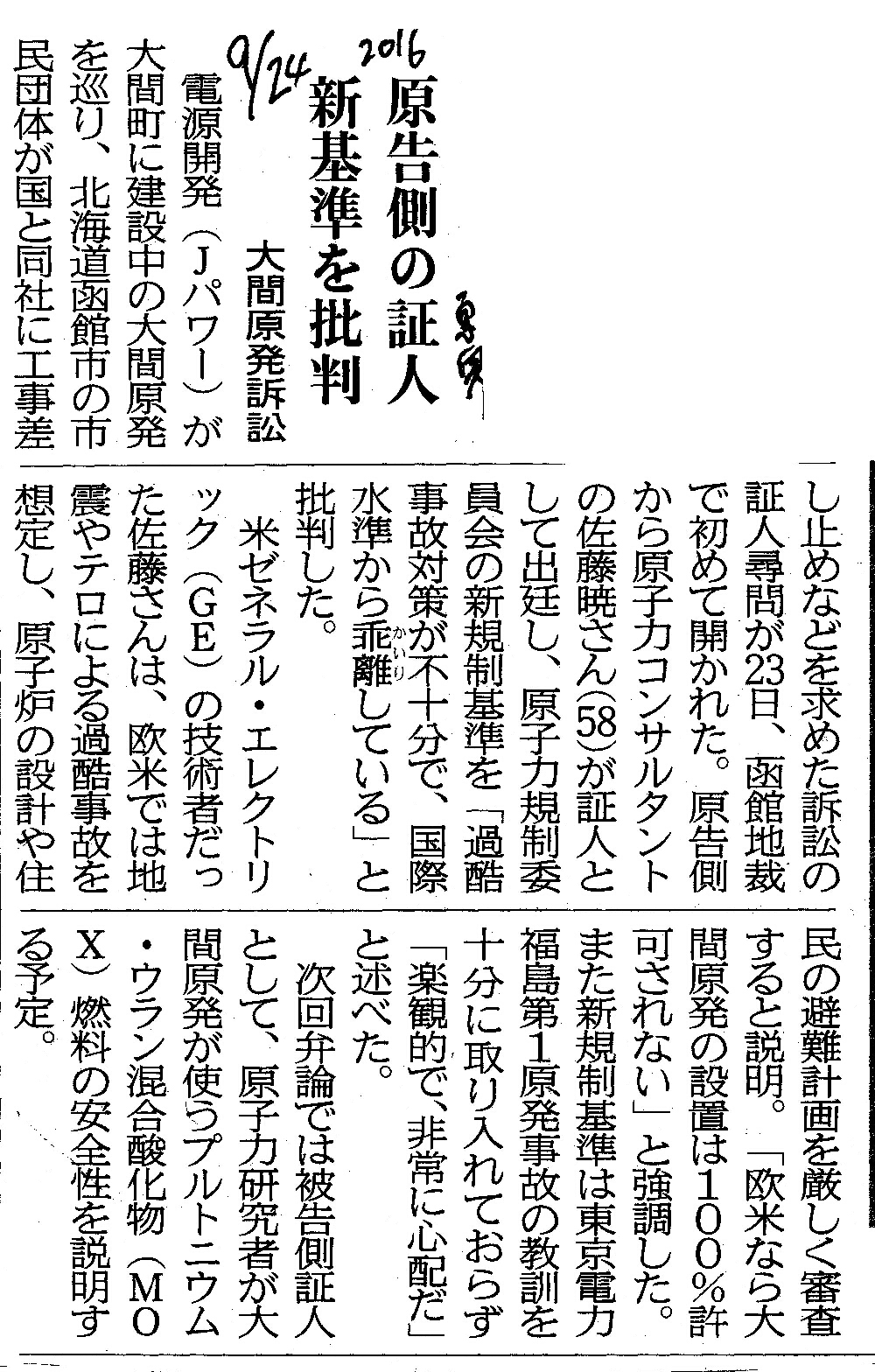 | [2016_09_24_01]原告側の証人 新基準を批判 大間原発訴訟(東奥日報2016年9月24日) |