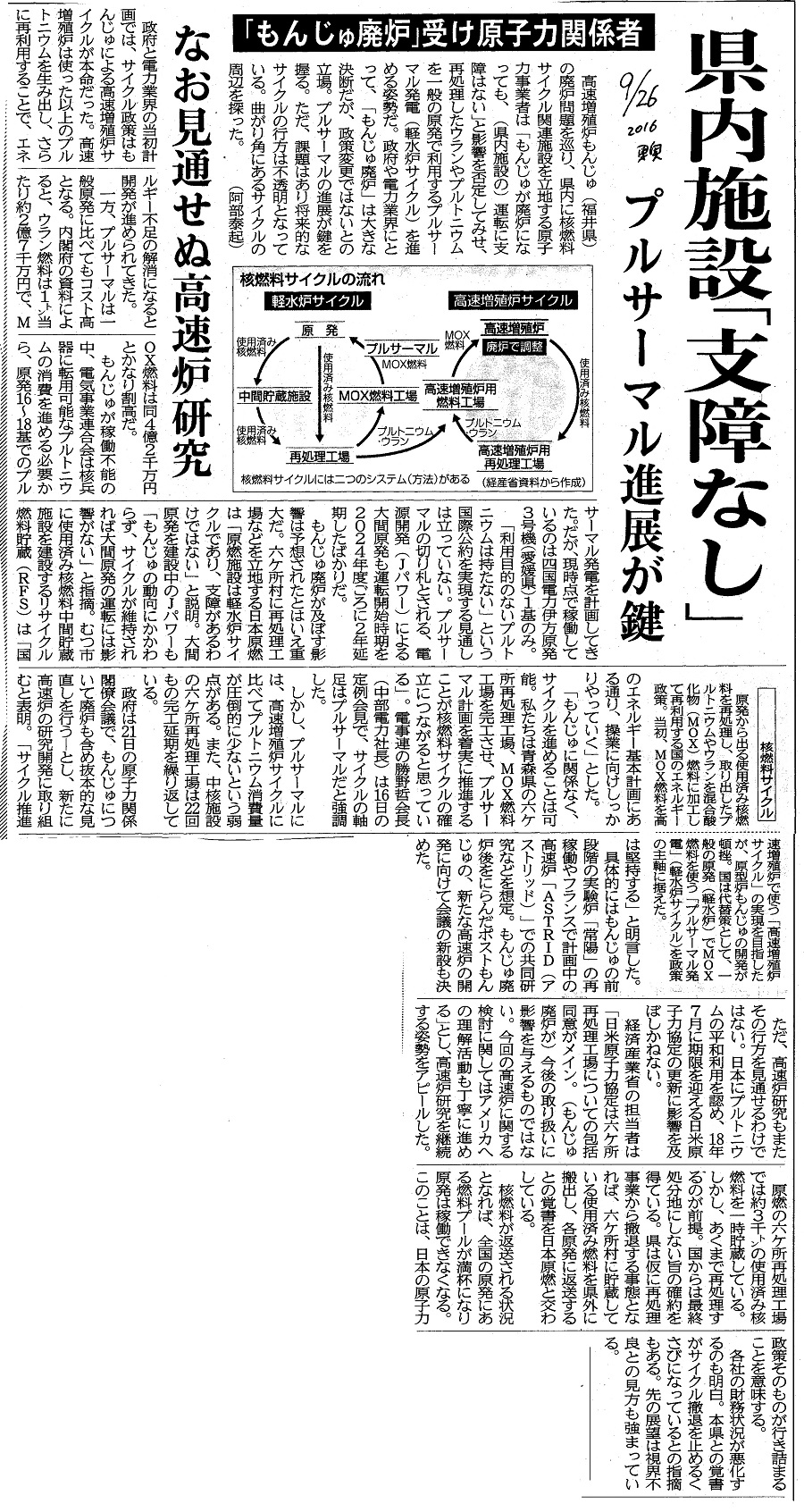 高速増殖炉もんじゅ(福井県)の廃炉問題を巡り、県内に核燃料サイクル関連施設を立地する原子力事業者は「もんじゅが廃炉になっても、(県内施設の)運転に支障はない」と影響を否定してみせ、再処理したウランやプルトニウムを一般の原発で利用するプルサーマル発電(軽水炉サイクル)を進める姿勢だ。政府や電力業界にとって、「もんじゅ廃炉」は大きな決断だが、政策変更ではないとの立場。プルサーマルの進展が鍵を握る。ただ、課題はあり将来的なサイクルの行方は不透明となっている。曲がり角にあるサイクルの周辺を探つた。 (阿部泰起)