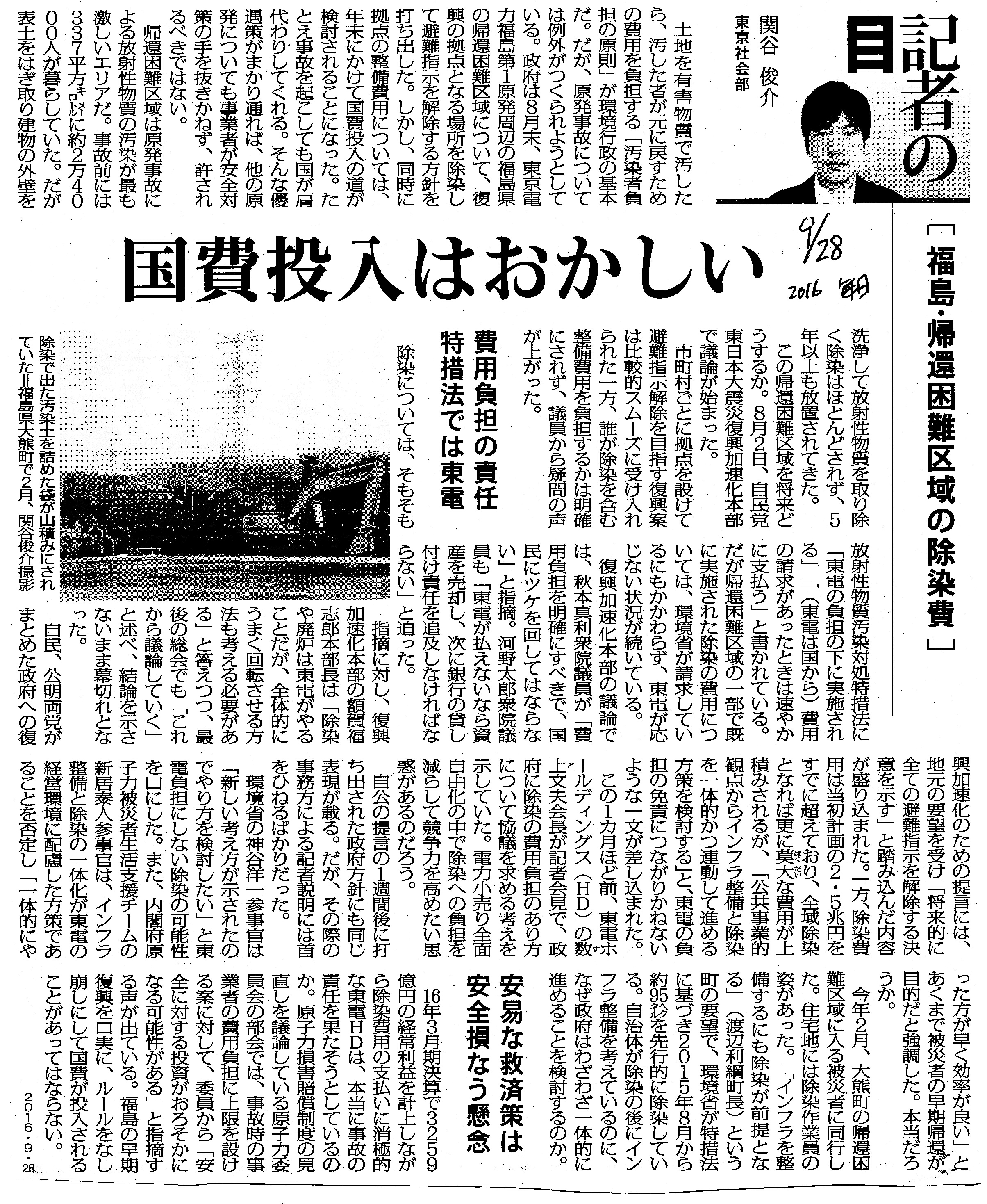 | [2016_09_28_07]記者の目 福島・帰還困難区域の除染費 国費投入はおかしい 費用負担の責任 特措法では東電 安易な救済策は安全損なう懸念(毎日新聞2016年9月28日) |