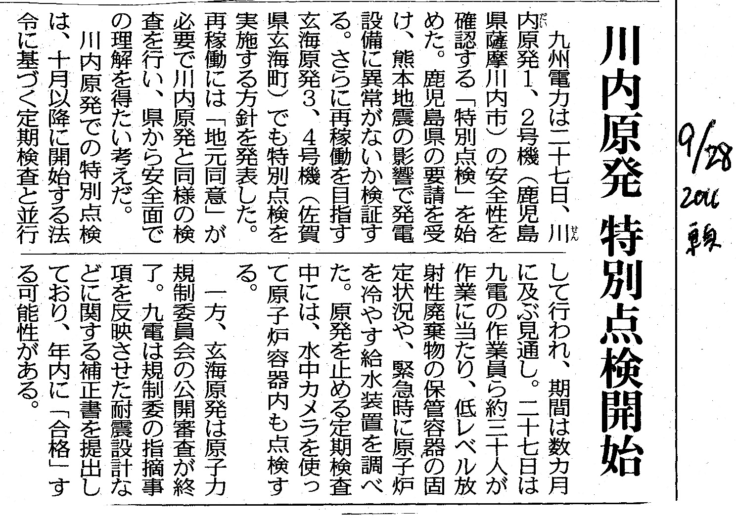 [2016_09_28_09]川内原発 特別点検開始(東奥日報2016年9月28日)