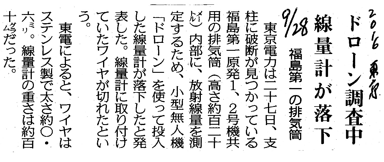 [2016_09_28_10]ドローン調査中 線量計が落下 福島第一の排気筒(東奥日報2016年9月28日)