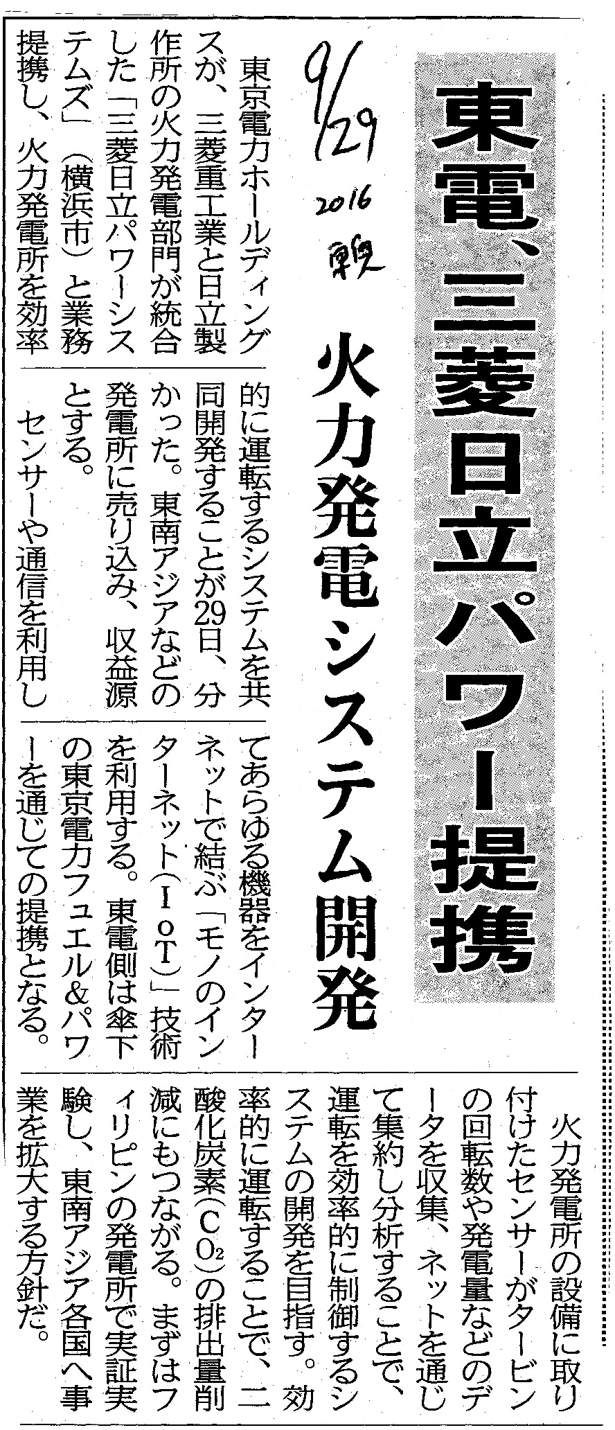 [2016_09_29_04]東電、三菱日立パワー提携 火力発電システム開発(東奥日報2016年9月29日)