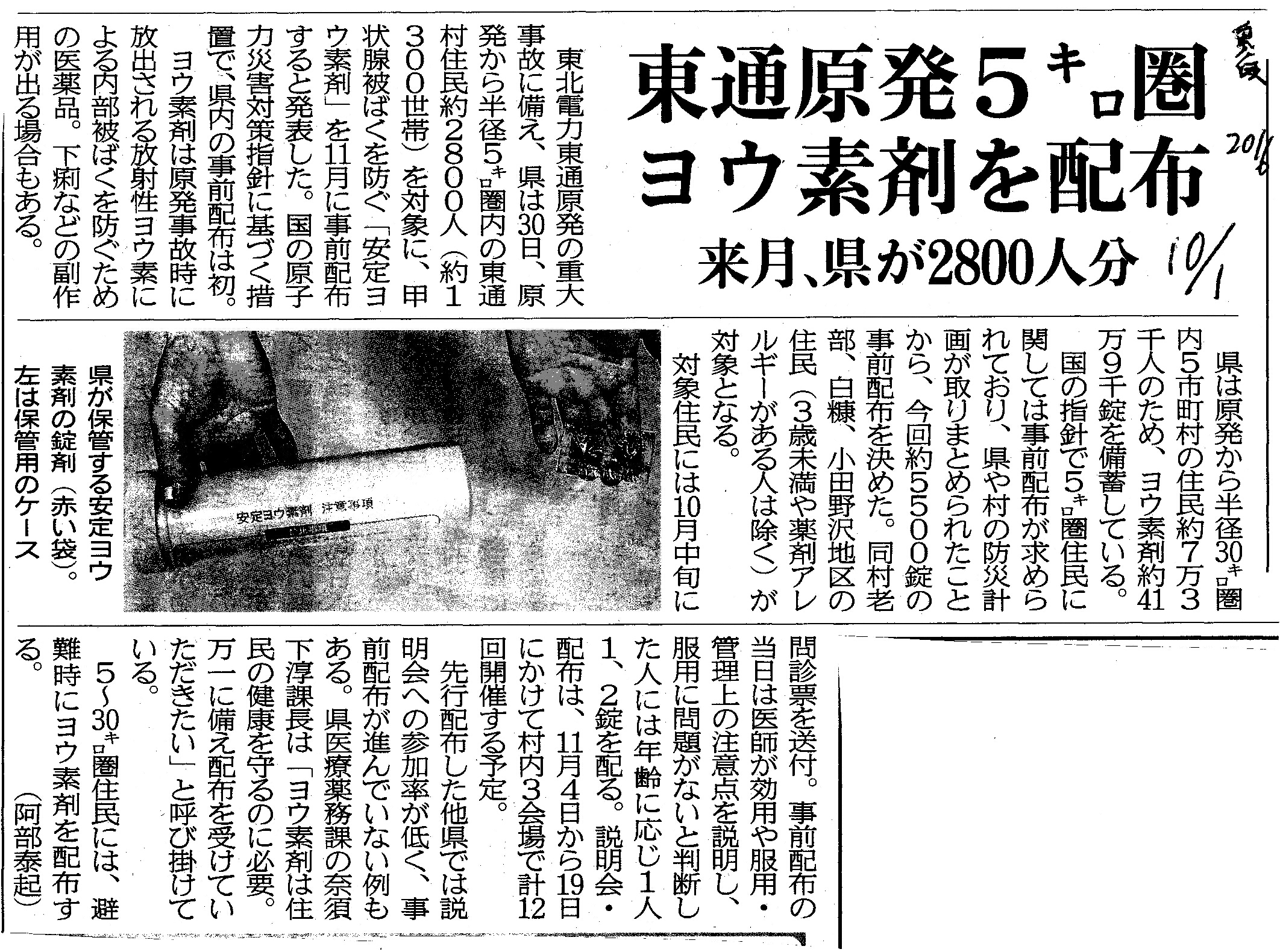 | [2016_10_01_01]東通原発5キロ圏ヨウ素剤を配布 来月、県が2800人分(東奥日報2016年10月1日) |