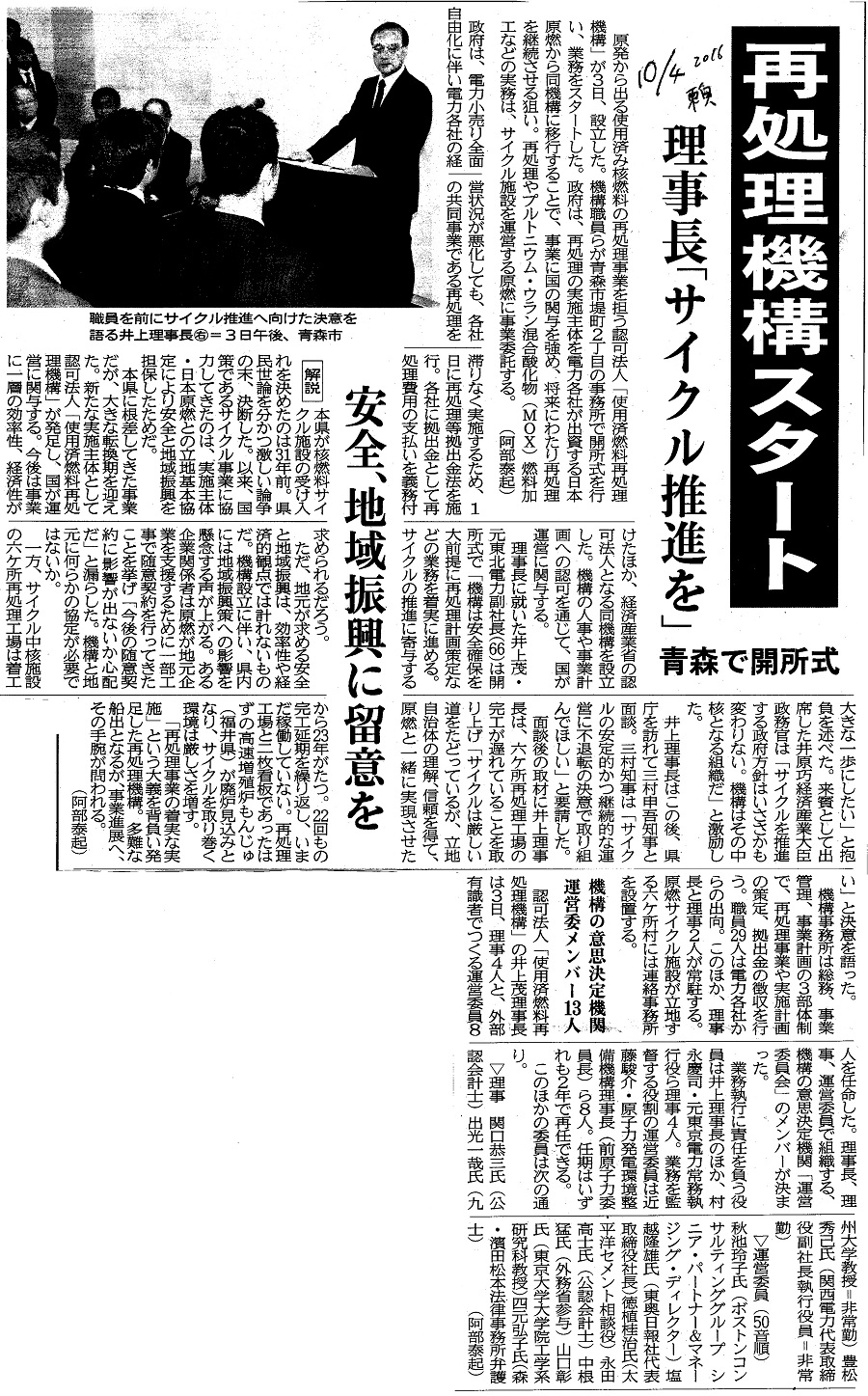 | [2016_10_04_02]再処理機構スタート 理事長「サイクル推進を」 青森で開所式 安全、地域振興に留意を(東奥日報2016年10月4日) |