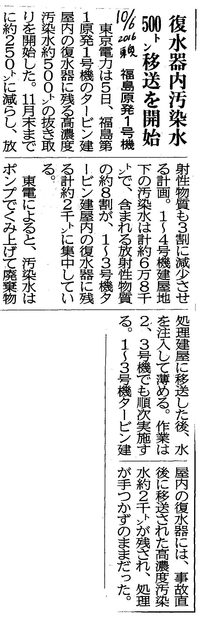 | [2016_10_06_03]復水器内汚染水 500トン移送を開始 福島原発第1号機(東奥日報2016年10月6日) |