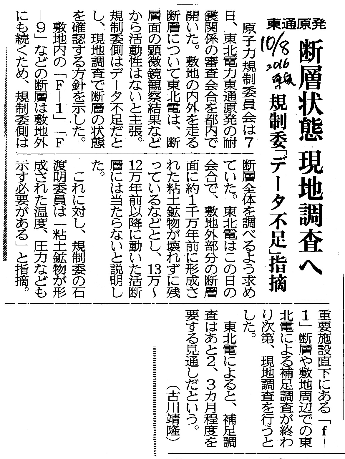 | [2016_10_08_14]東通原発 断層状態 現地調査へ 規制委「データ不足」指摘(東奥日報2016年10月8日) |