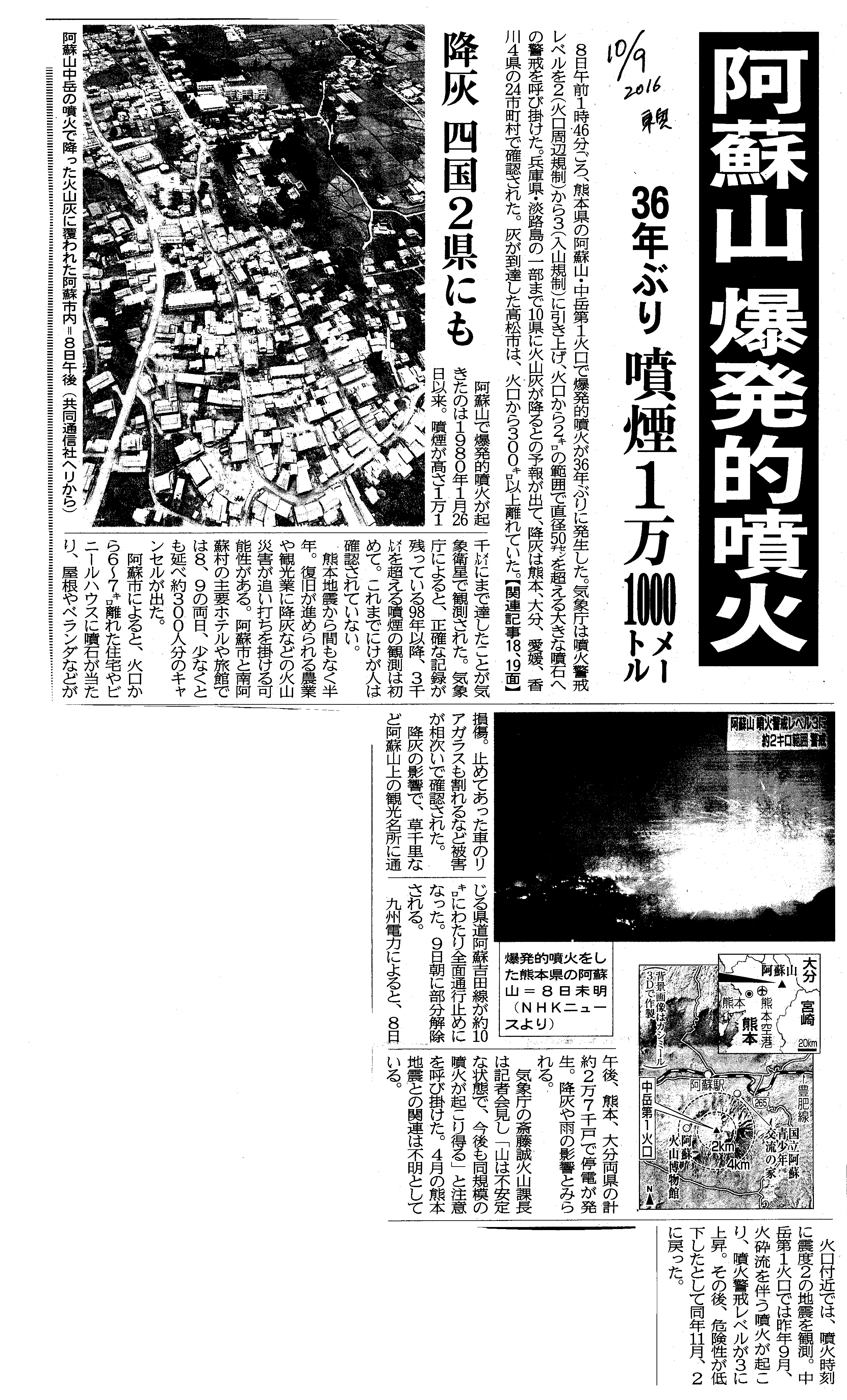 [2016_10_09_04]阿蘇山 爆発的噴火 36年ぶり 噴煙1万1000メートル 降灰 四国2県にも(東奥日報2016年10月9日)