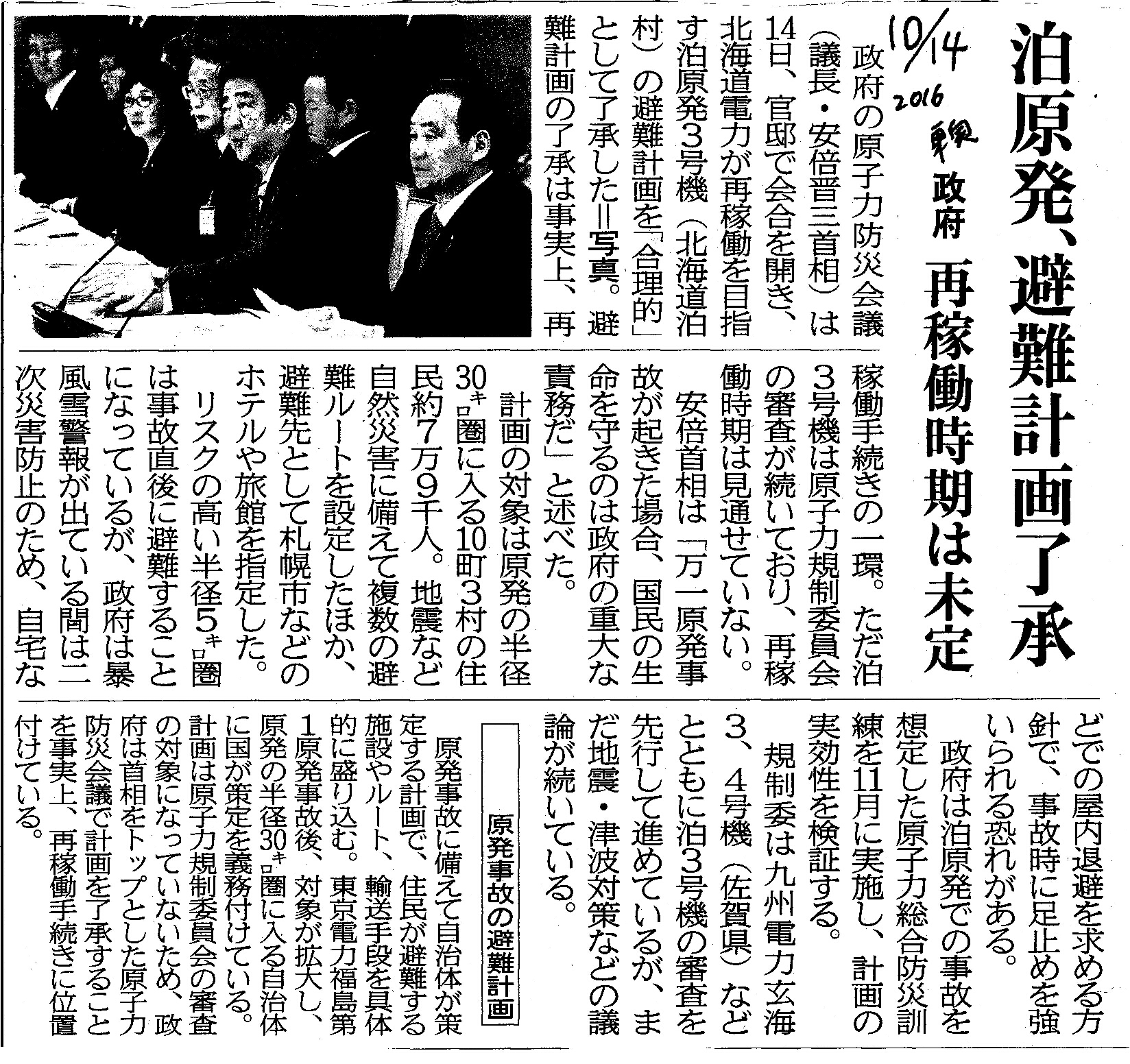 | [2016_10_14_02]泊原発、避難計画了承 政府 再稼働時期は未定(東奥日報2016年10月14日) |