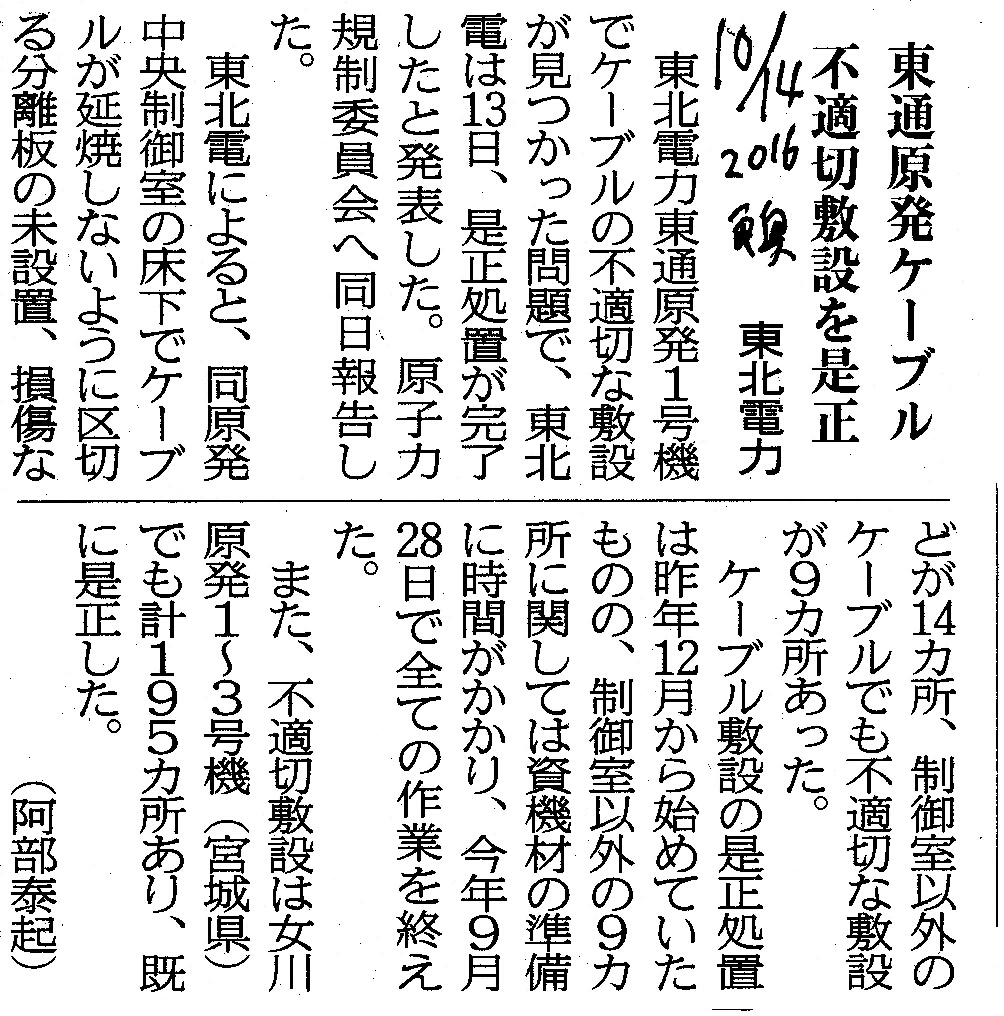 | [2016_10_14_04]東通原発ケーブル 不適切敷設を是正 東北電力(東奥日報2016年10月14日) |