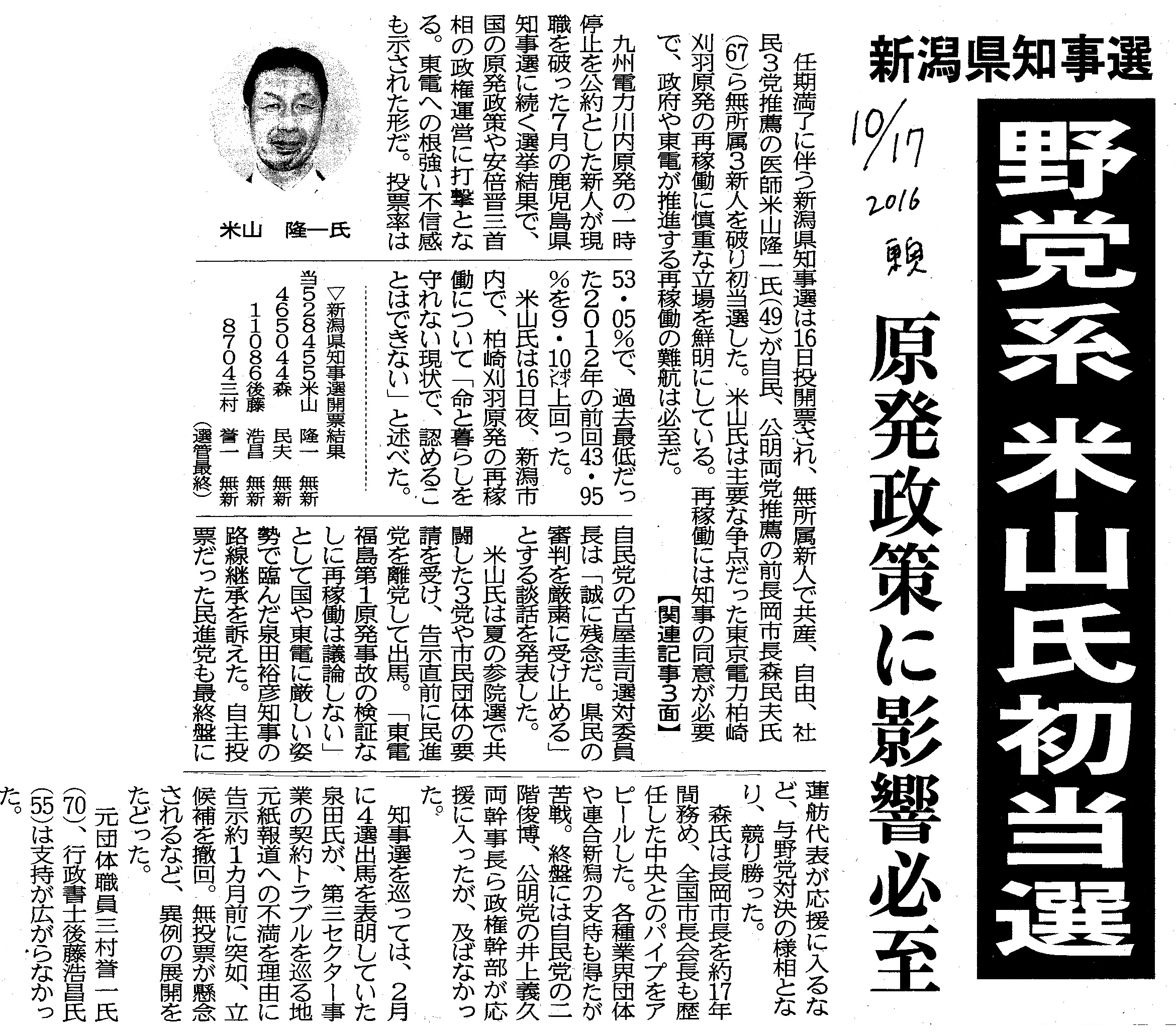 [2016_10_17_02]新潟県知事選 野党系 米山氏初当選 原発政策に影響必至(東奥日報2016年10月17日)