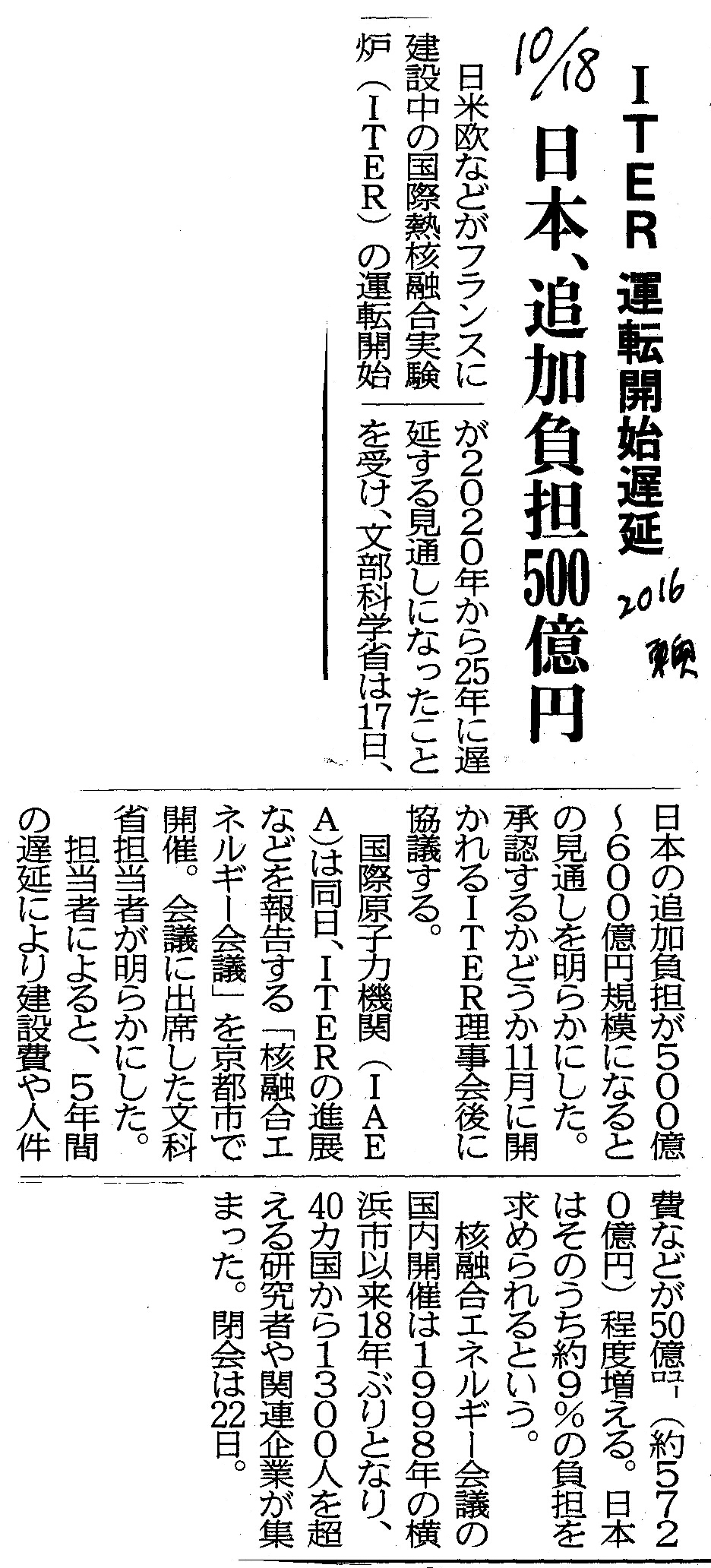 [2016_10_18_04]ITER 運転開始遅延 日本、追加負担500億円(東奥日報2016年10月18日)
