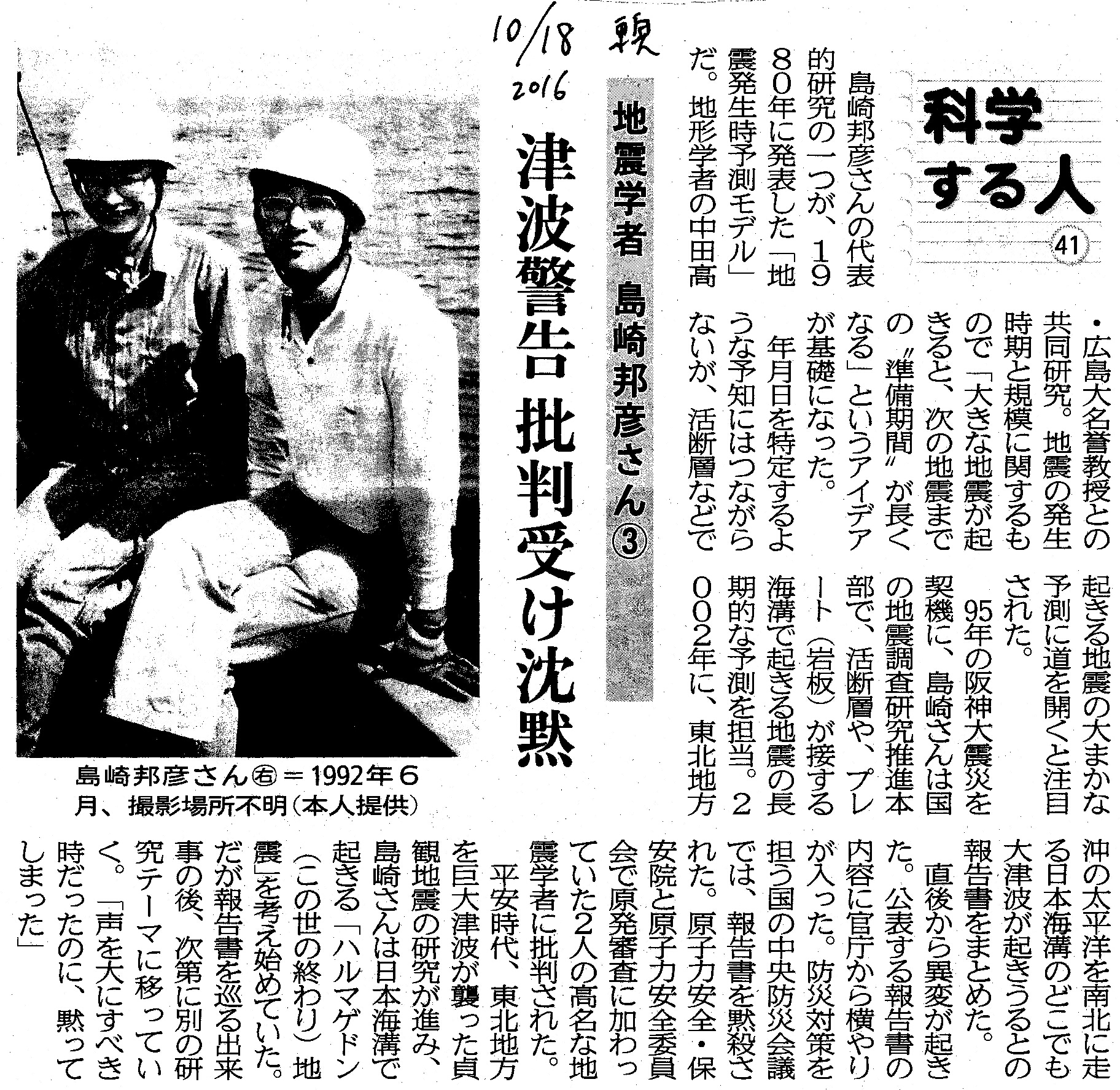 | [2016_10_18_05]科学する人 41 地震学者 島崎邦彦さん(3) 津波警告 批判受け沈黙 (東奥日報2016年10月18日) |