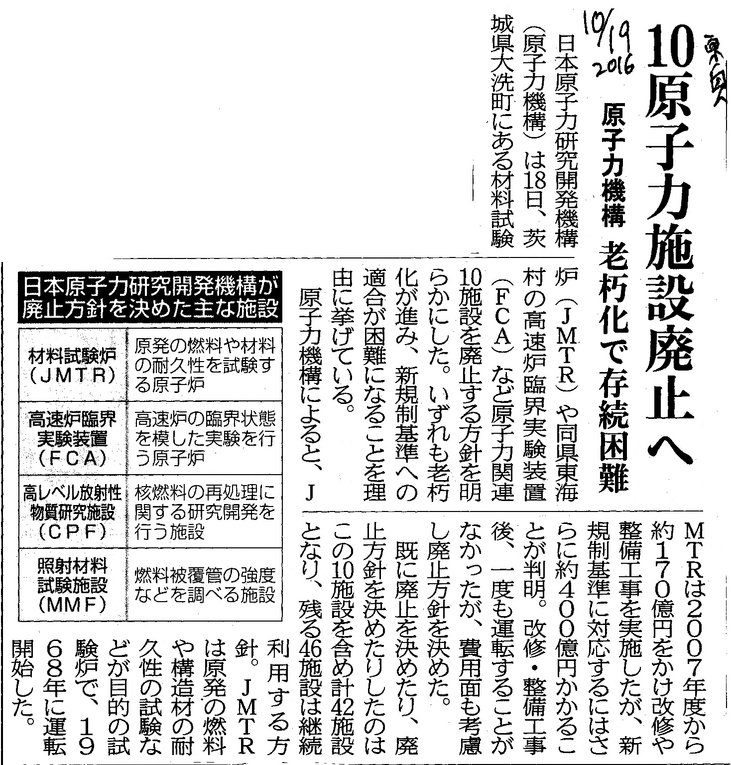 [2016_10_19_08]10原子力施設廃止へ 原子力機構 老朽化で存続困難(東奥日報2016年10月19日)