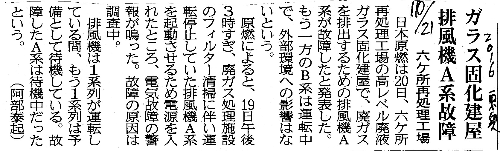 | [2016_10_21_12]ガラス固化建屋 排風機A系故障 六ヶ所再処理工場(東奥日報2016年10月21日) |