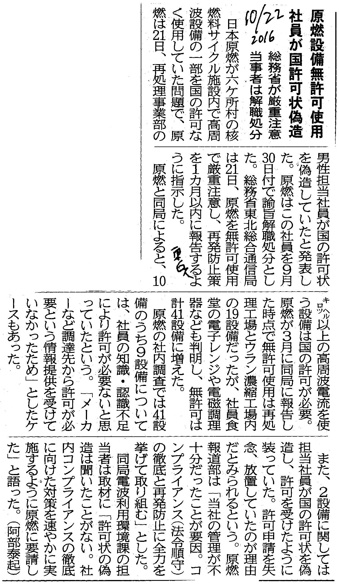 | [2016_10_22_10]原燃設備無許可使用 社員が国許可状偽造 総務省が厳重注意 当事者は解職処分(東奥日報2016年10月22日) |