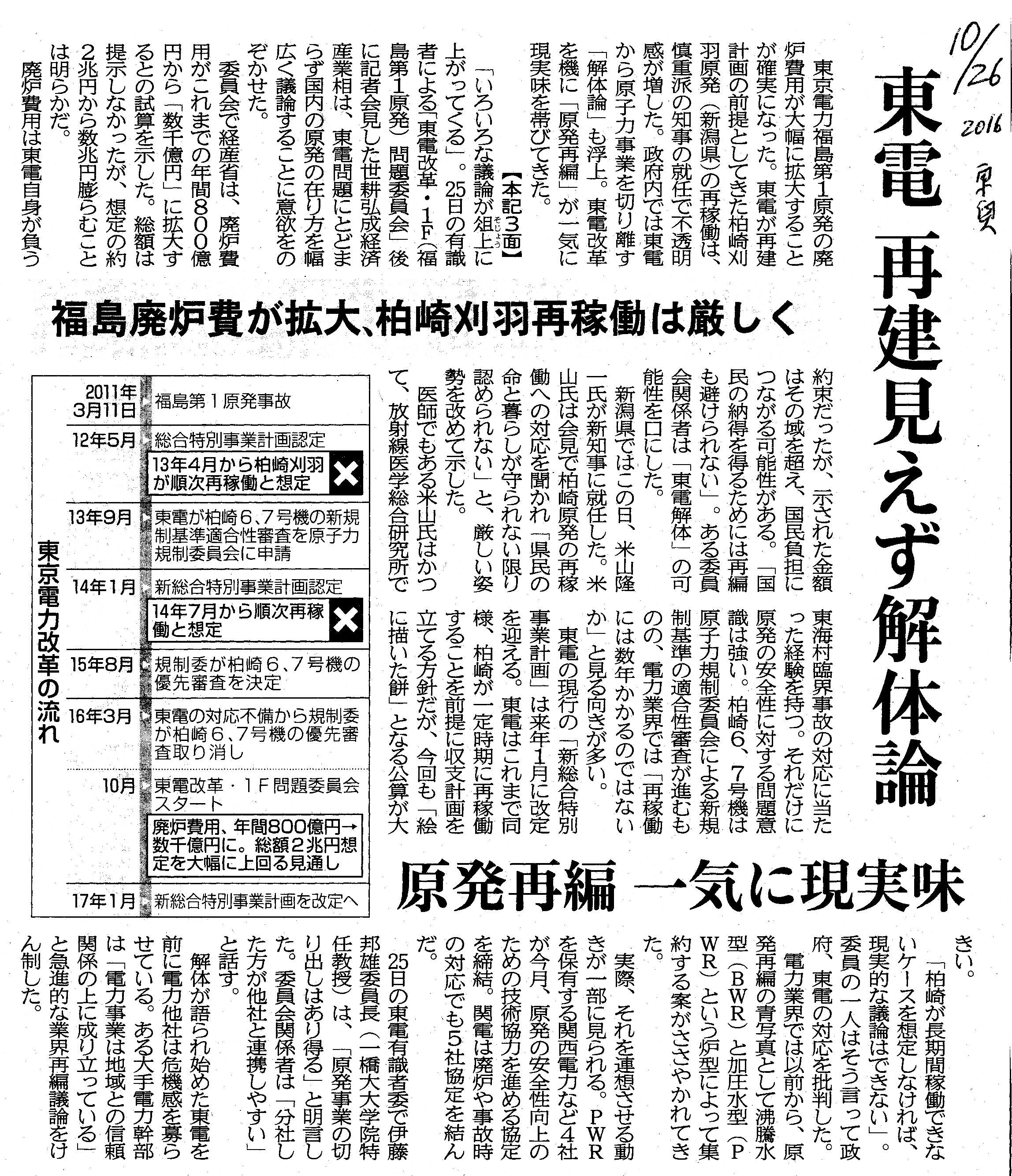[2016_10_26_01]東電 再建見えず解体論 福島廃炉費が拡大、柏崎刈羽再稼働は厳しく 原発再編一気に現実味(東奥日報2016年10月26日)