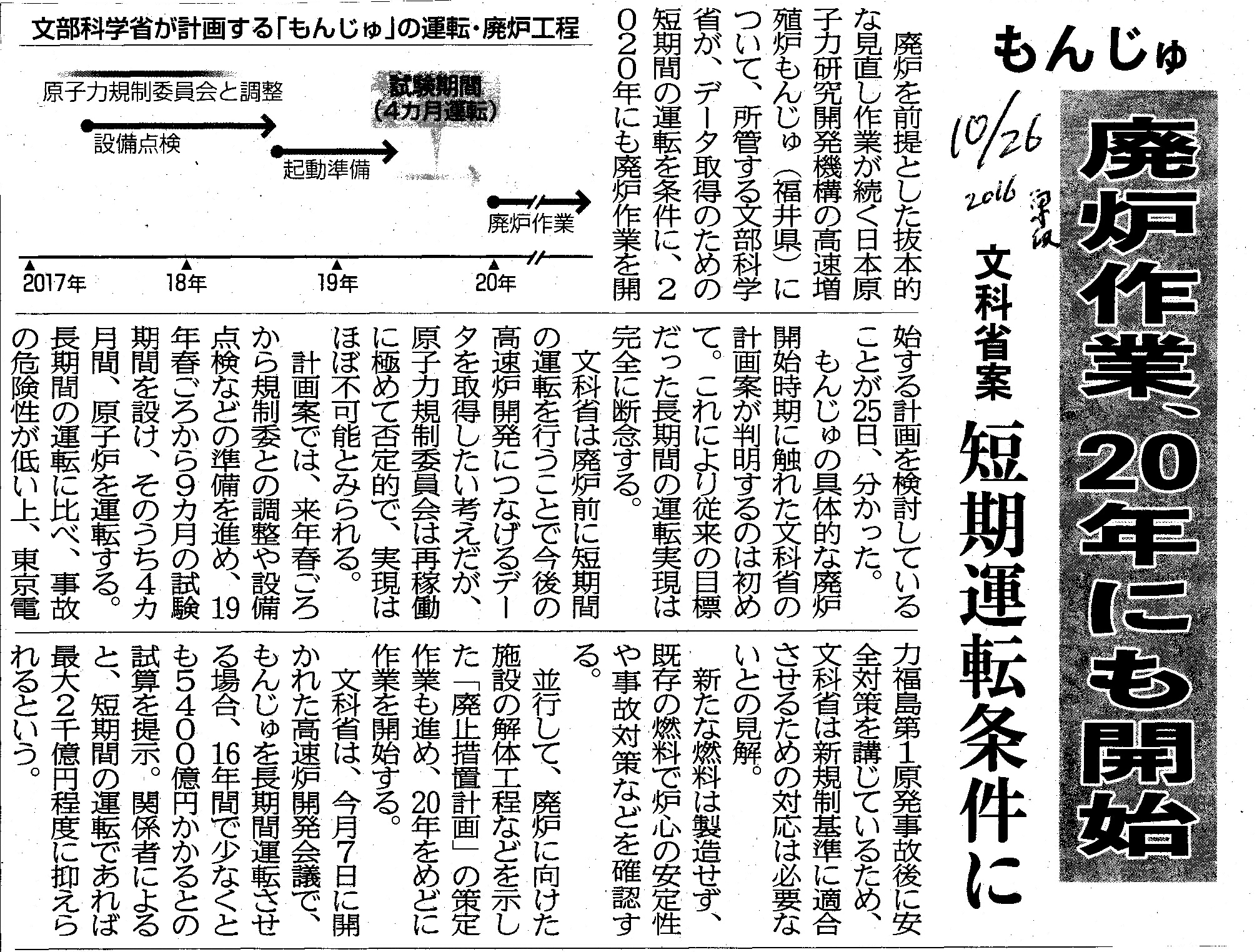 [2016_10_26_03]もんじゅ 廃炉作業、20年にも開始 文科省案 短期運転条件に(東奥日報2016年10月26日)