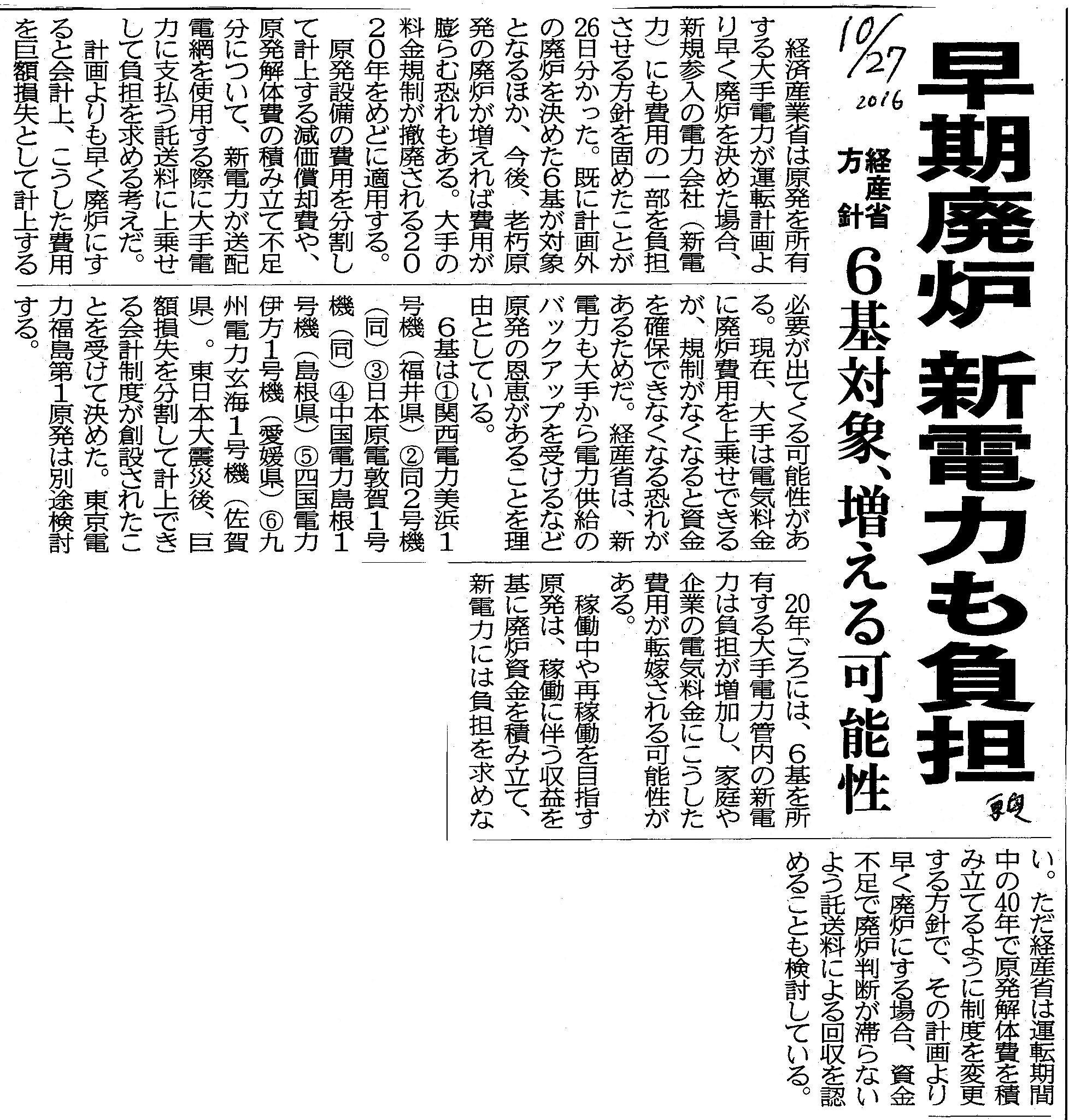 | [2016_10_27_01]早期廃炉 新電力も負担 経産省方針 6基対象、増える可能性(東奥日報2016年10月27日) |