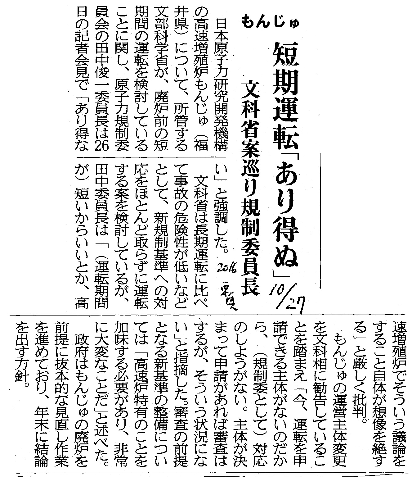[2016_10_27_02]もんじゅ 短期運転「有り得ぬ」 文科省案巡り規制委員長(東奥日報2016年10月27日)