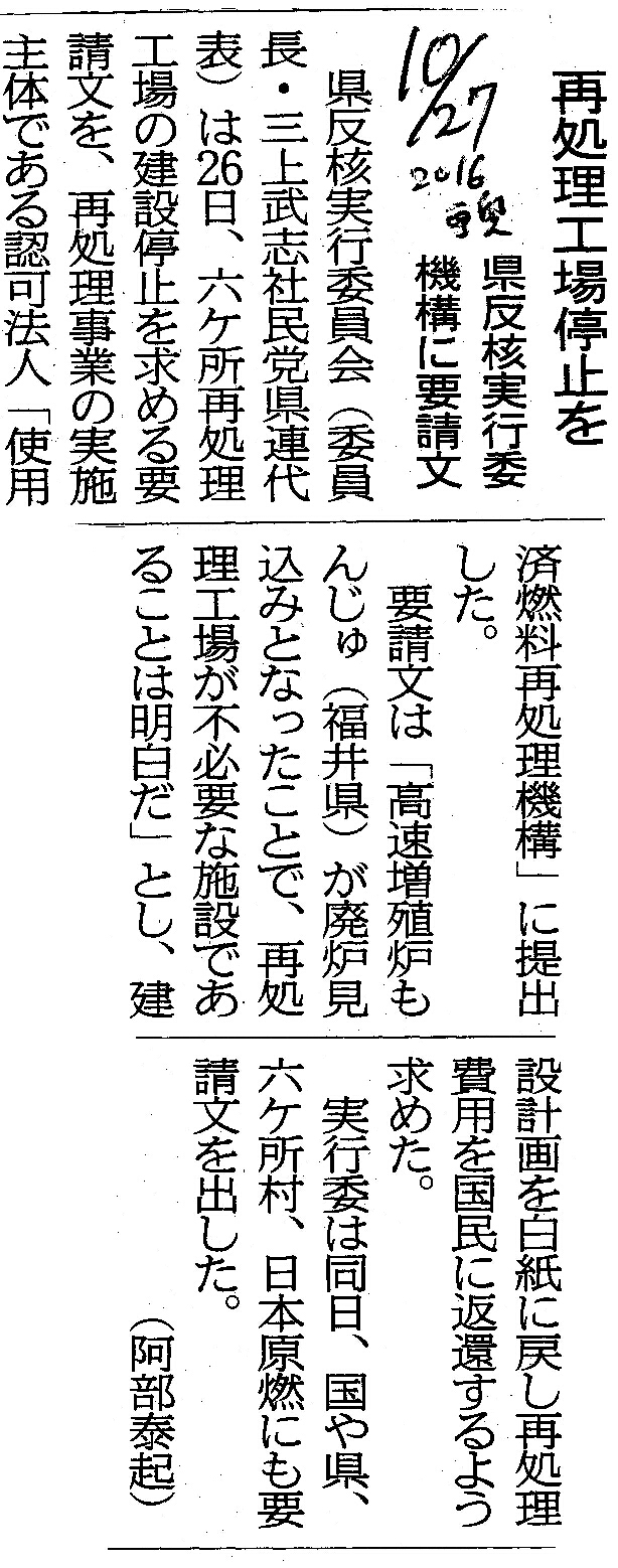| [2016_10_27_03]再処理工場停止を 県反核実行委 機構に要請文(東奥日報2016年10月27日) |