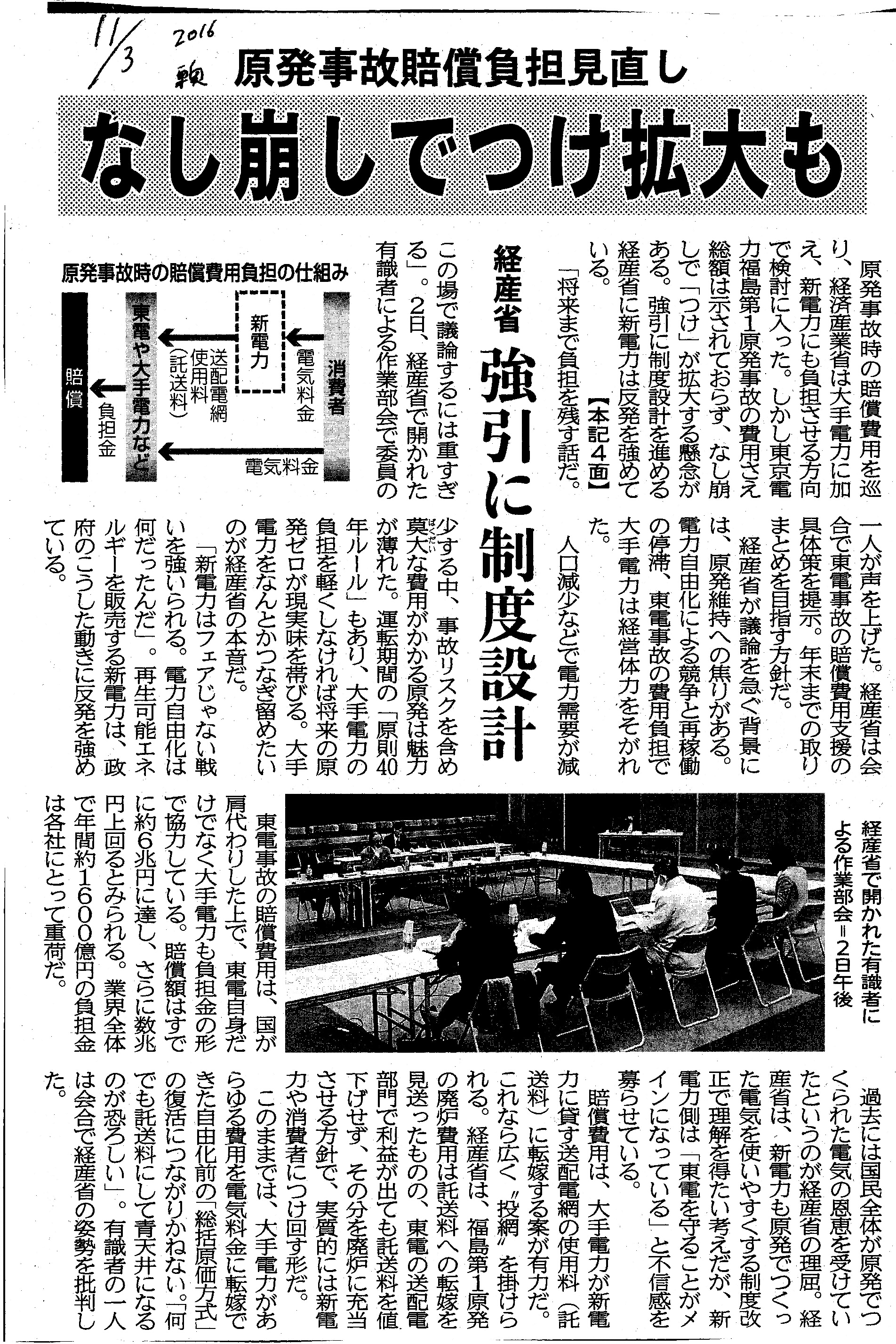 [2016_11_03_01]原発事故賠償負担見直し なし崩しでつけ拡大も 経産省 強引に制度設計(東奥日報2016年11月3日)