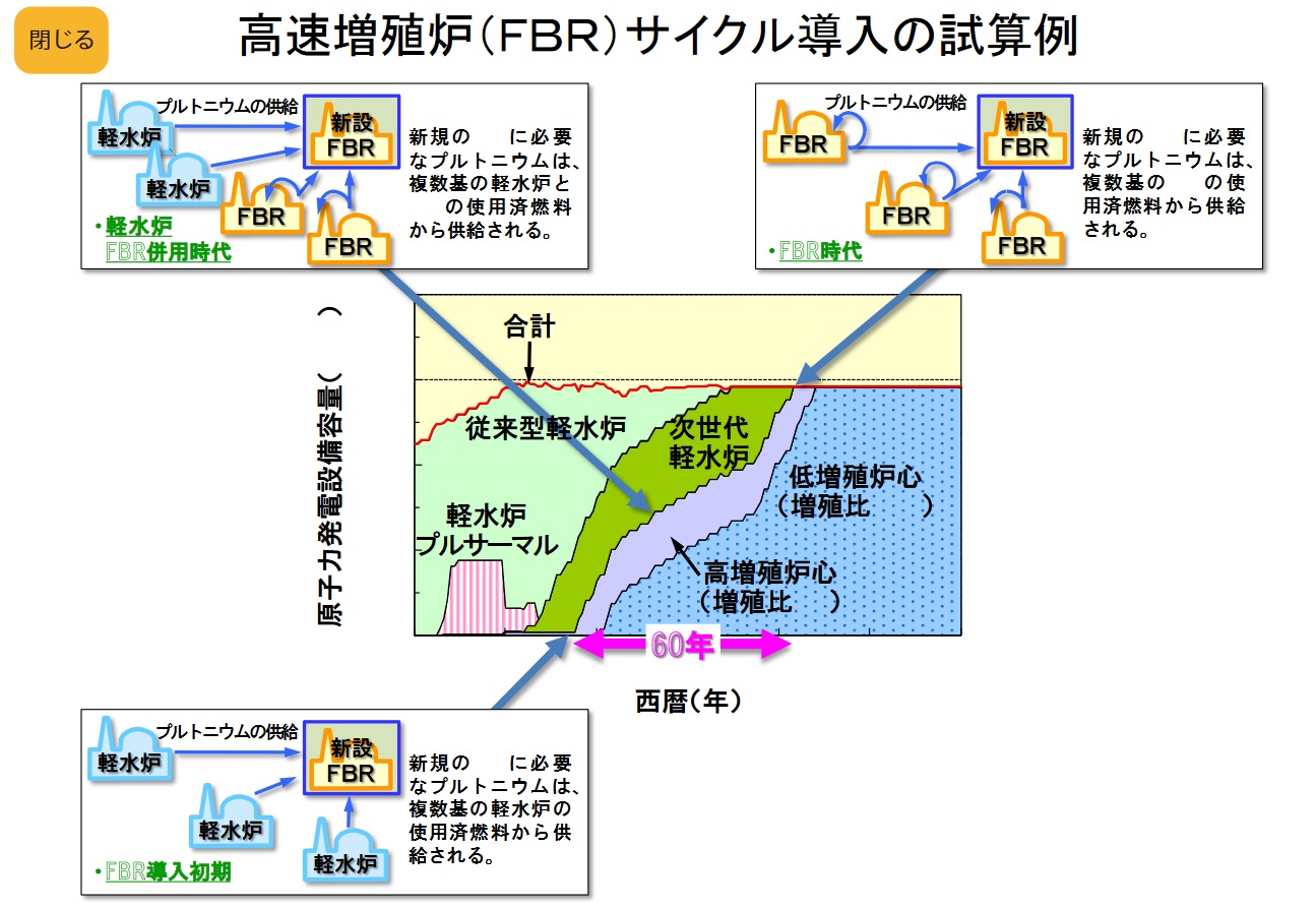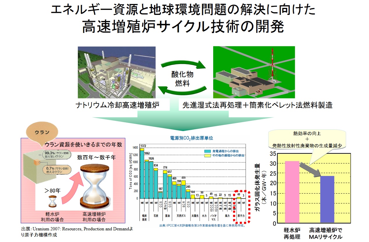 参照元 1.1 なぜ高速増殖炉の研究開発が必要か?-詳細- エネルギー資源に乏しい我が国においては、長期的なエネルギー安定供給の確保は国の存立基盤をなす重要な課題です。また、エネルギーの安定供給と地球温暖化対策の両立も重要な課題です。 高速増殖炉は、発電過程において二酸化炭素を排出しないという原子力発電の特性を持っているうえに、発電しながら消費した燃料以上の燃料を生産することができます。これまで通りの軽水炉の利用では、ウランが潜在的に持つエネルギーの0.5%しか使えませんが、プルサーマル利用によって0.75%を利用できるようになります。さらに、高速増殖炉は、その能力を最大限活かすことができ、ウランが潜在的に持つエネルギーの60%程度を取出すことができます。これによりウラン資源の利用効率を飛躍的に高め、我が国のエネルギー安定供給に大きく貢献できます。また、高速増殖炉は、高レベル放射性廃棄物中に長期に残留する放射性の核種を効率的に燃焼できるため、核燃料サイクルの中にその核種を閉じ込め、高レベル放射性廃棄物の発生量等を低減し環境負荷を現行よりさらに低減させる可能性を有しています。エネルギー安定供給と環境保全の両立のためには高速増殖炉サイクルの開発が必要であり、国と民間はオールジャパン体制でその開発を進めています。 関連情報リンク ・原子力政策大綱(平成17年10月14日閣議決定) ・日本のエネルギー2009(経済産業省資源エネルギー庁) 図1.1 エネルギー資源と地球環境問題の解決に向けた高速増殖炉サイクル技術の開発 ![]() 参照元 1.2 高速増殖炉はどのようなステップで実用化していくのか?-詳細- 高速増殖炉の開発は、実験炉(「常陽」(熱出力14万kW)※1)、原型炉(「もんじゅ」(電気出力28万kW))、実証炉(電気出力50万kW〜75万kW)※2、実用炉(電気出力150万kW)※3と段階的に開発を進めます(※1:「常陽」は発電炉ではない。 ※2、※3:検討上の値)。 実証炉は、実用炉の経済性を予測し得る炉として、実用炉とほぼ同じ仕様ですが、出力規模は数分の一となります。原型炉は、実証炉を建設する前に技術的な課題を摘出・解決し、発電プラントとして実証することを主目的としています。経済性の見通しを確認する必要がないため、機器・設備の技術の基盤は実証炉と共通ですが、機器・設備の課題摘出と解決のために形状や構造に違いがあり、実証炉のミニチュアとはなりません。実験炉とは、高速増殖炉を構成する様々な技術の基礎を確認するため、原子炉そのものの本質的な部分、つまり、冷却材としてナトリウムを取扱うこと、ウランとプルトニウムを混ぜた混合酸化物(MOX)燃料の炉心から熱を取出すことに重点を置いた設計となっています。 実験炉「常陽」については、これまで臨界を確認した上で増殖比の確認や規模は小さいが実際の原子炉でのナトリウム取扱技術の経験を積んできました。 その次の段階として発電機能を有する我が国唯一の発電用高速増殖炉である「もんじゅ」では、その運転・保守経験を通じた研究開発成果を実証炉以降の高速増殖炉の設計・建設・運転・保守に反映していきます。 また、このような「もんじゅ」の運転と並行して、建設コストの大幅な削減やさらなる安全性の向上が期待される革新的な技術等の研究開発や、そのような技術に基づく設計研究を実施しています。 これらの成果を踏まえ、2015年頃に実証炉・実用炉の概念設計と実用化に至るまでの研究開発計画を提示する計画です。 関連情報リンク ・高速増殖炉サイクル技術の今後10年程度の間における研究開発に関する基本方針(平成18年12月26日原子力委員会決定) ・上記参考資料 図1.2 高速増殖炉の実現手順とそのゴール ![]() 参照元 1.3 高速増殖炉の燃料が倍になるのに数十年かかるので、高速増殖炉の基数を増やすには長い年月が係るのではないか? -詳細- 軽水炉から得られるプルトニウムなど、外部からプルトニウムの供給が一切ない状況において、1基の高速増殖炉自らが増殖した燃料だけで2基目の燃料を賄おうとするのであれば、2基目の高速増殖炉の炉心分の燃料を作り出すのに数十年かかりますが、実際にはその年数で高速増殖炉が増えるわけではありません。 我が国では既に軽水炉による原子力発電が行われています。ここで、高速増殖炉は、運転期間を終了した軽水炉を順次置き換えることによって導入されるため、軽水炉と高速増殖炉が共存する期間が半世紀以上に亘って存在します。高速増殖炉導入の初期においては、軽水炉の使用済燃料を再処理して回収されるプルトニウムを十分利用できます。さらに高速増殖炉の導入が進み、高速増殖炉が原子力発電の主流となって軽水炉の使用済燃料から供給されるプルトニウムが少なくなってきた時点では、複数の高速増殖炉によって増殖されたプルトニウムを加えることによって新設する高速増殖炉に必要なプルトニウムを確保することができます。 日本の軽水炉サイクルを想定した