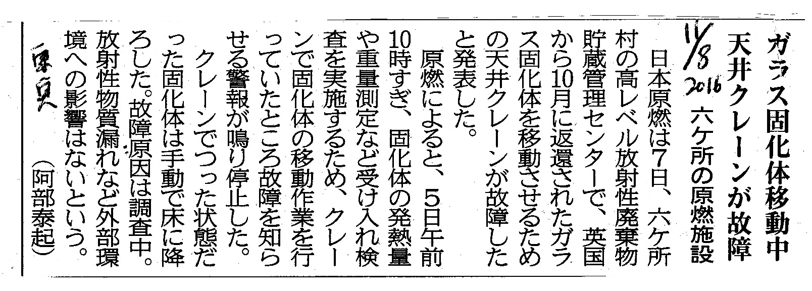| [2016_11_08_03]ガラス固化体移動中 天井クレーンが故障 六ヶ所の原燃施設(東奥日報2016年11月8日) |