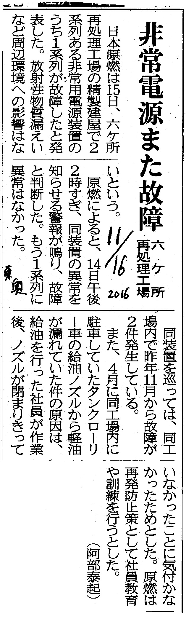 | [2016_11_16_02]非常電源また故障 六ヶ所再処理工場(東奥日報2016年11月16日) |