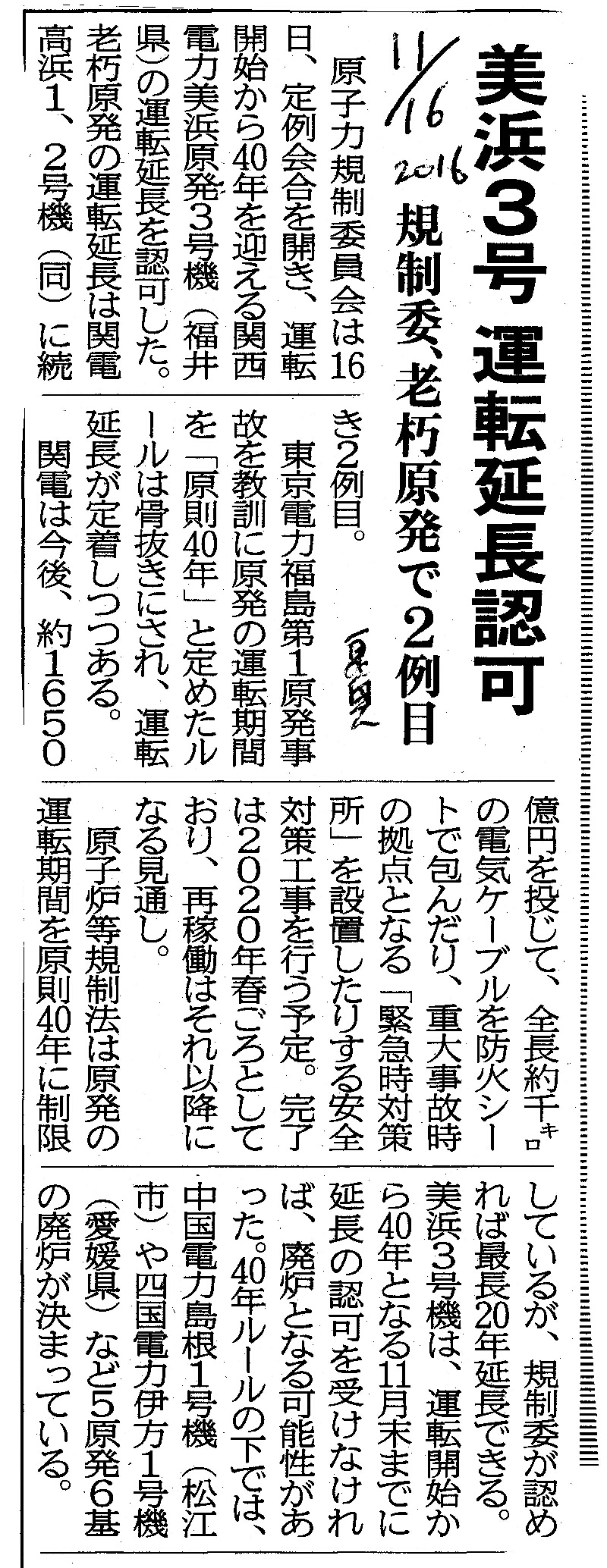 [2016_11_16_03]美浜3号 運転延長認可 規制委、老朽原発で2例目(東奥日報2016年11月16日)